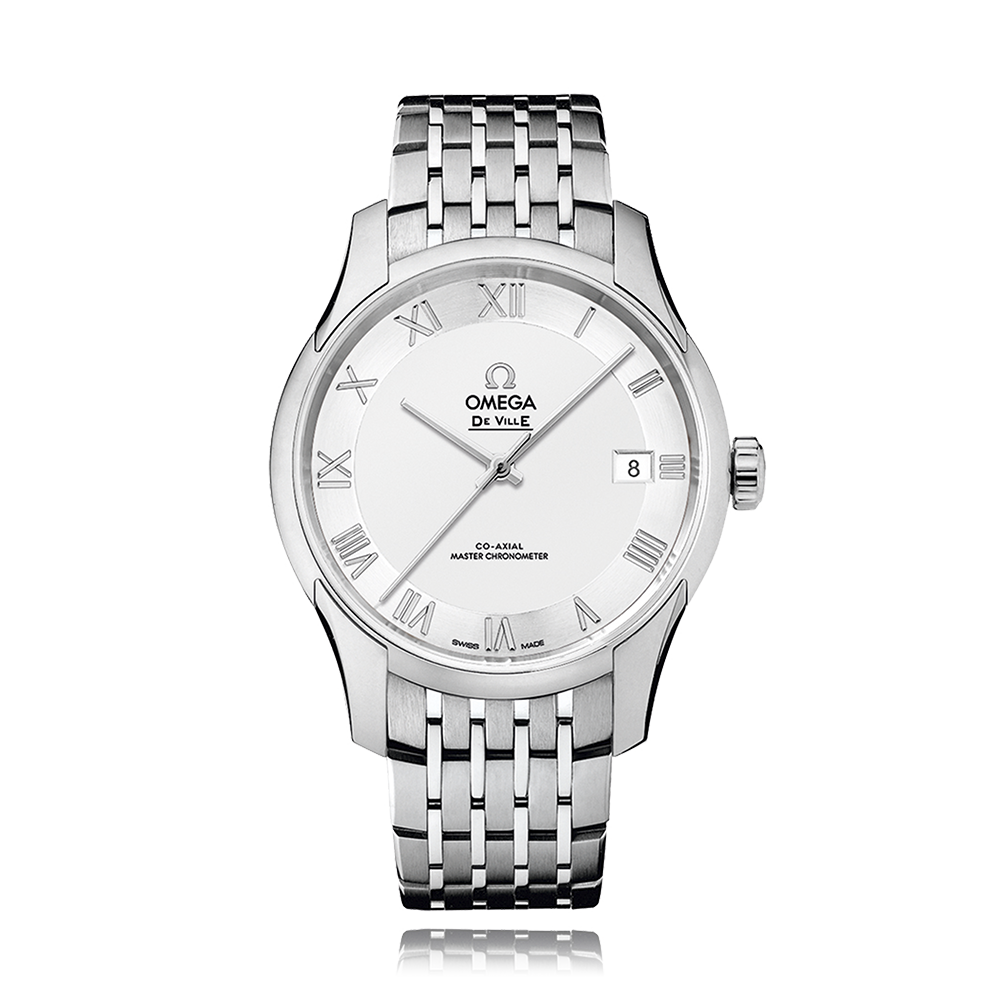 Omega De Ville with a 41 mm stainless steel case and a sapphire glass, water resistant; inside is the automatic calibre 8901, a silver roman face with date indication, the bracelet is a steel metal bracelet; accessory: sales guarantee (original), sales box (original).