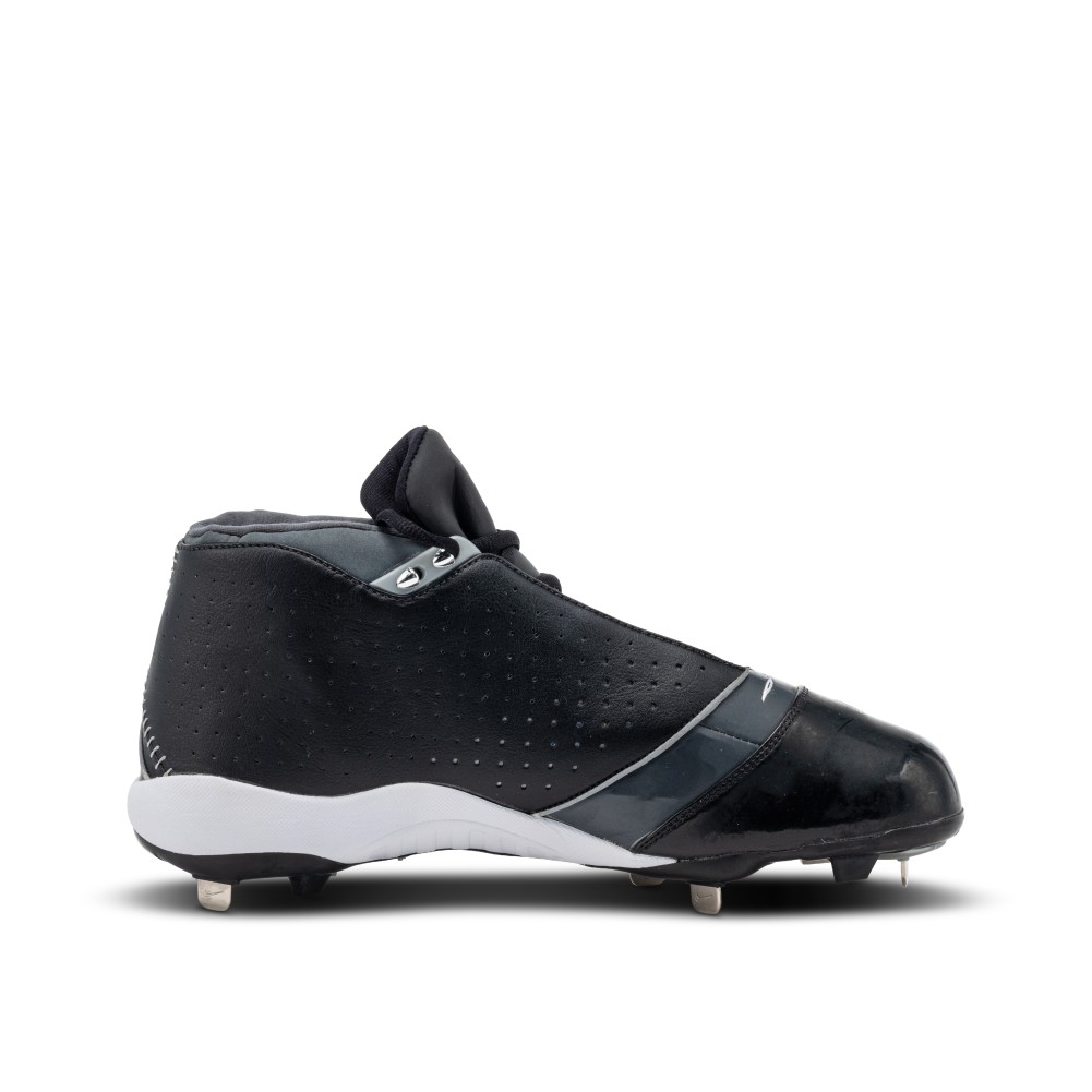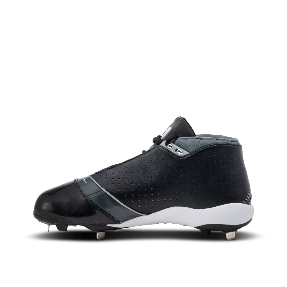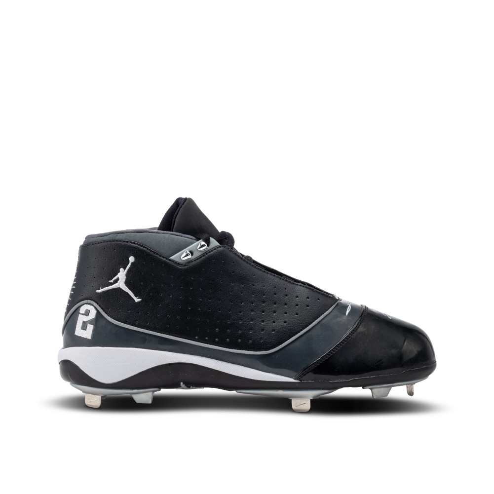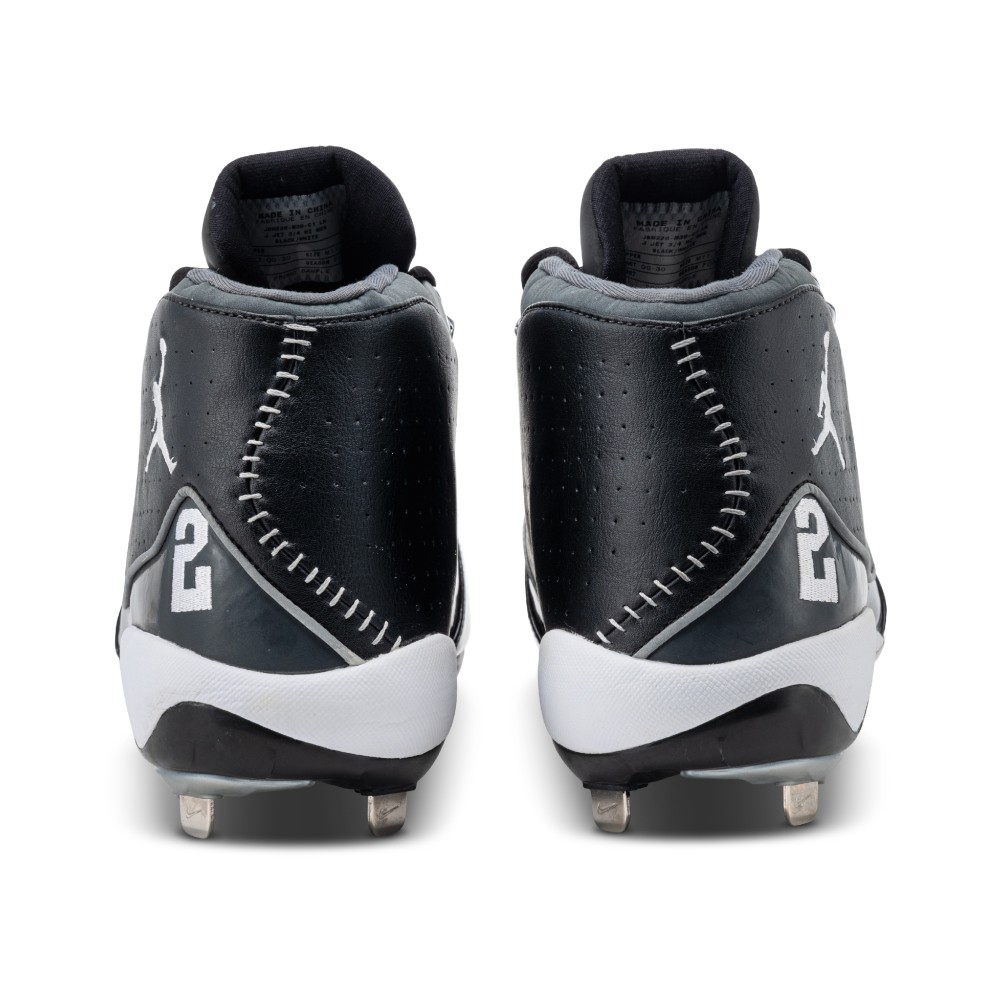 In 2004, Jordan Brand released the Air Jordan ?Jumpman Jet? metal baseball cleats for Derek Jeter to wear on the field during the MLB season. This promo sample pair notably features a perforated outer along with black laces, a black upper, black and white midsoles, and gray and black outsoles. Each cleat contains five metal spikes and three rubber spikes. The unique design includes ?Jeter? stitched into the toe area in white along with ?DJ2? and the Jumpman logo on each tongue. In addition, the lateral heel area of each cleat features the number 2 along with the Jumpman logo. Lastly, the stitching on the heels resembles the seams on a baseball.