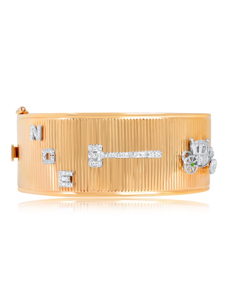 Reeded hinged bangle surmounted with Art Deco diamond-set figural charms.