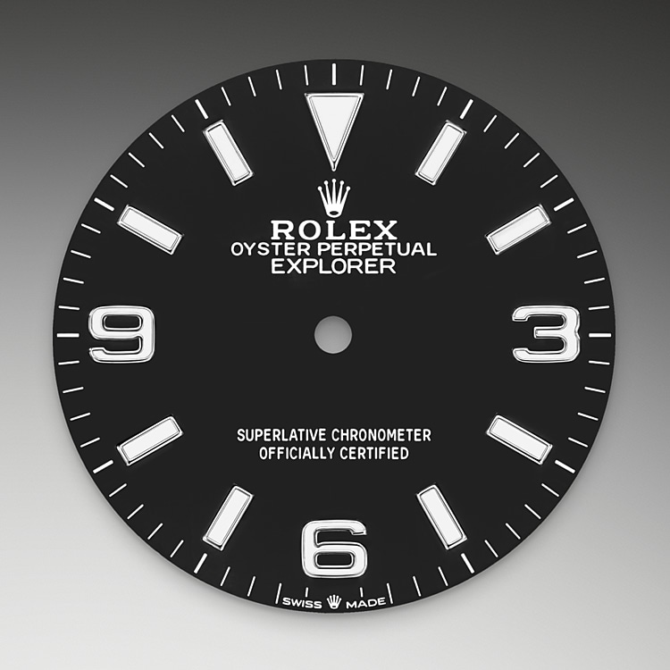 The dial is the distinctive face of a Rolex watch, the feature most responsible for its identity and readability. The Explorer model?s characteristic 3, 6 and 9 numerals are filled with a luminescent material emitting a long-lasting blue glow, like the hour markers and hands. Like all Rolex timepieces, the Explorer 36’s dial is designed and manufactured in-house, largely by hand to ensure perfection.