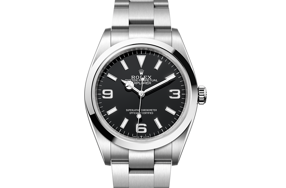 The Oyster Perpetual Explorer 36 imparts a fresh elan to the sober, clean lines that have long established it as an icon. The smooth bezel in Oystersteel is robust yet elegant, and in perfect harmony with the Explorer?s iconic heritage.