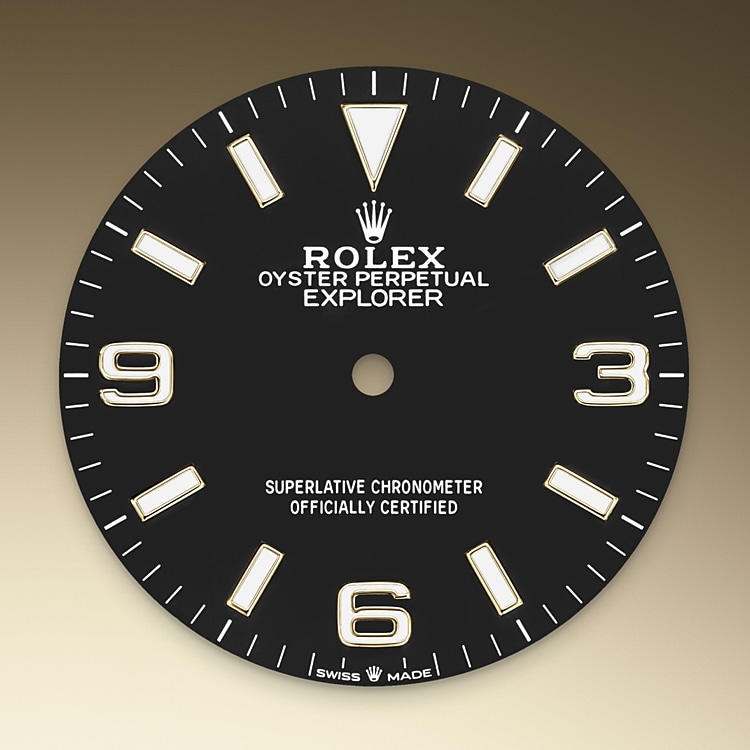 The dial is the distinctive face of a Rolex watch, the feature most responsible for its identity and readability. The Explorer model?s characteristic 3, 6 and 9 numerals are filled with a luminescent material emitting a long-lasting blue glow, like the hour markers and hands. Like all Rolex timepieces, the Explorer 36’s dial is designed and manufactured in-house, largely by hand to ensure perfection.