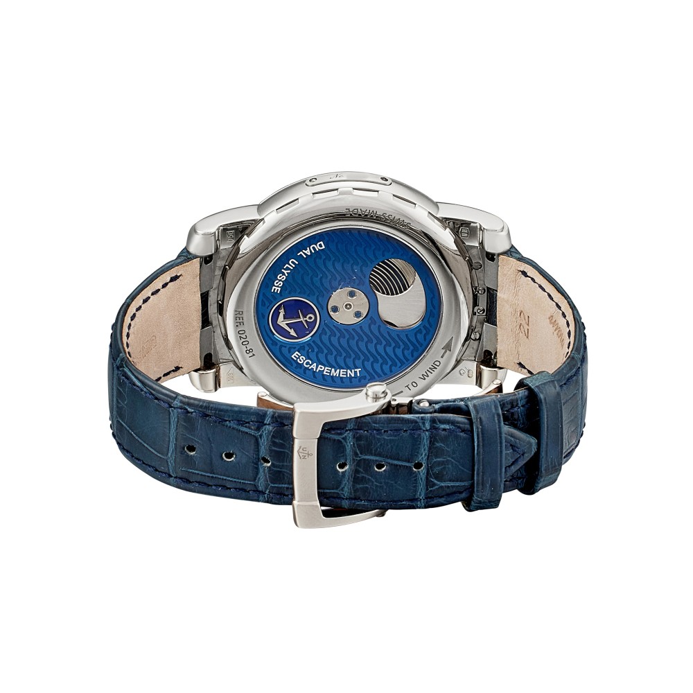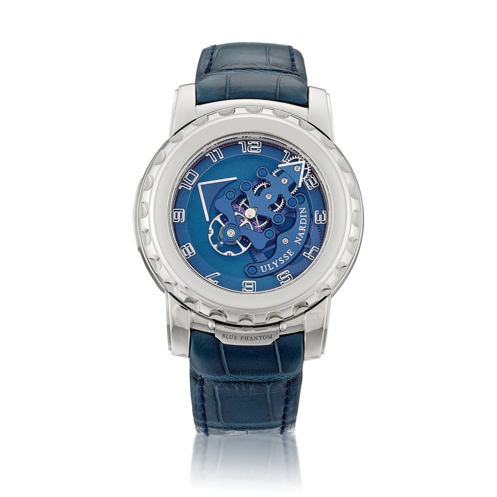 The Freak is the brainchild of Dr. Ludwig Oechslin, as interpreted and conceived by Ulysse Nardin’s research and production team. In contrast to mystery clocks of the past, the Freak is an open secret?all parts pivot and move in total transparency. This Freak Blue Phantom 28’800 V/h is a 7 days Carrousel Tourbillon, without hands, dial or crown. This watch is called the Freak 28’800 V/h because everything in this movement is so radically different that the concept of the movement and the case had to be rethought. This watch does not need hands and dial; it indicates the time by the rotation of the movement. The arrow decorating the main spring barrel indicates the hour while the upper bridge, fitted with the balance wheel assembly and its revolutionary Dual Ulysse Escapement, revolves once every hour indicating the minutes. During its 60-minute rotation, the upper bridge lays bare the mechanics of time. The center axis pivots in the sapphire crystal of the watch case. This is a spectacular sight, accentuated by the finishing skills of Ulysse Nardin’s watchmakers in Le Locle. In other tourbillons, the balance wheel assembly moves once every minute in a cage. In this Freak, the whole movement, including the balance wheel assembly, rotates once an hour inside the watch case. This watch comes with a full set of original paper and box.