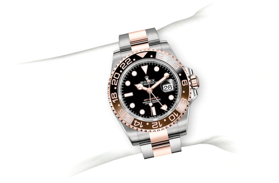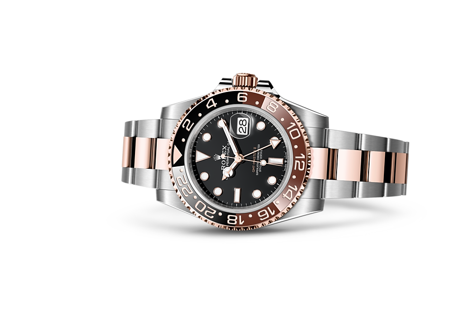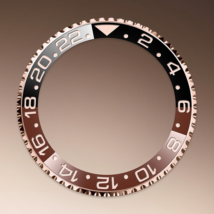 This model features a black dial and a two-colour Cerachrom bezel insert in brown and black ceramic. In addition to conventional hour, minute and seconds hands, the GMT-Master II features an arrow-tipped hand, which circles the dial once every 24 hours, as well as a bidirectional rotatable 24-hour graduated bezel. The distinctively coloured 24-hour hand displays the ?home? reference time in a first time zone which can be read on the graduations on the bezel. The traveller?s local time is easily set by ?jumping? from hour to hour, thanks to an ingenious mechanism operated via the winding crown: the hour hand can be adjusted forwards or backwards independently of the minute and seconds hands. This allows travellers to adapt to their new time zone without affecting the precision of their timekeeping.