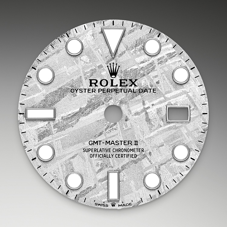 This model is the only GMT-Master II with a meteorite dial. Meteorite comes from the heart of an asteroid or possibly even a planet that has exploded, propelling material across the Solar System until chance brings it into our planet?s orbit and gravity pulls it to Earth. During its journey, the centre of the meteorite is gradually transformed, producing highly unusual metallic patterns, resulting from the very slow cooling of molten asteroid cores. The designers at Rolex create from these configurations a unique treasure for some of the most prestigious models, including this GMT-Master II.