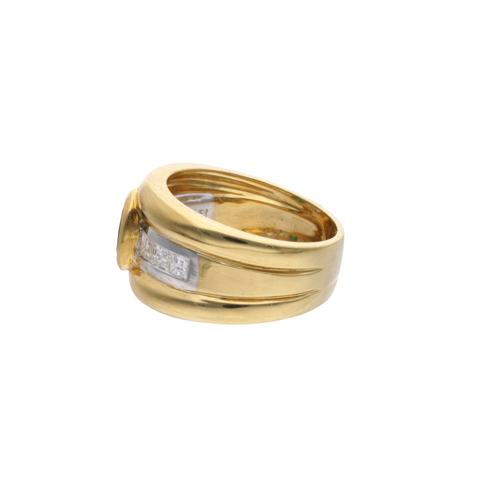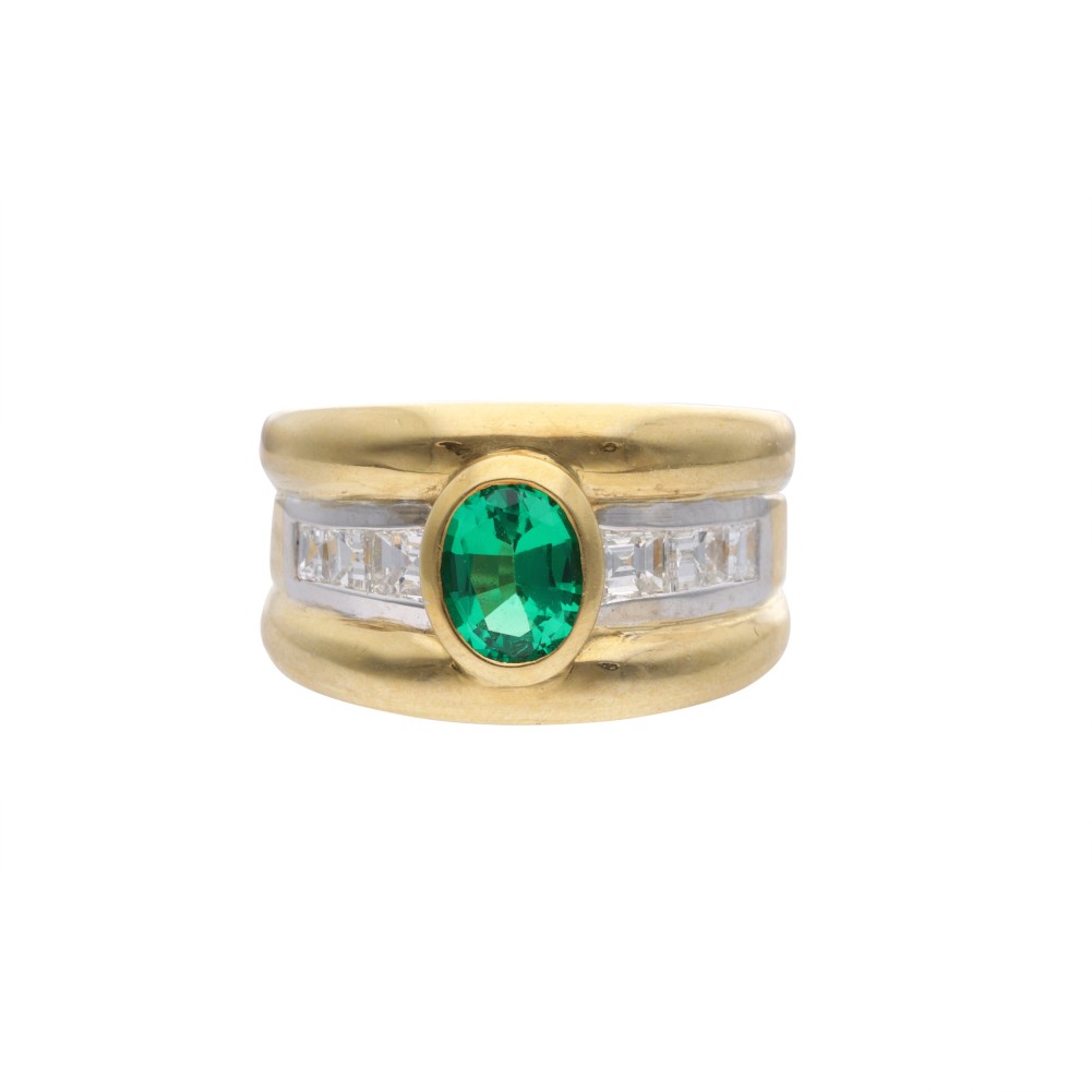 Composed of an oval-shaped emerald and accented by carr?-cut diamonds.