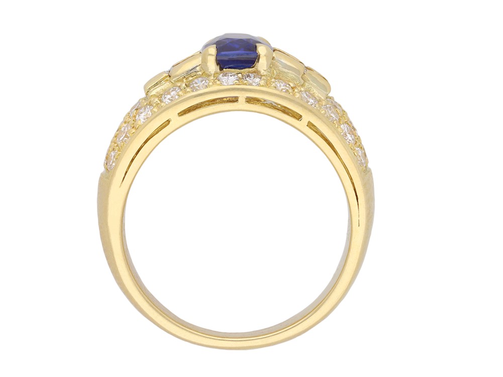 Set to the center with one octagonal old-cut natural sapphire in an open-back claw setting, flanked by four rectangular step-cut diamonds, further adorned by 30 round brilliant-cut diamonds