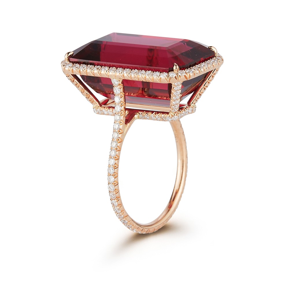 Centering a rectangular shaped rubellite, accented by round diamonds.