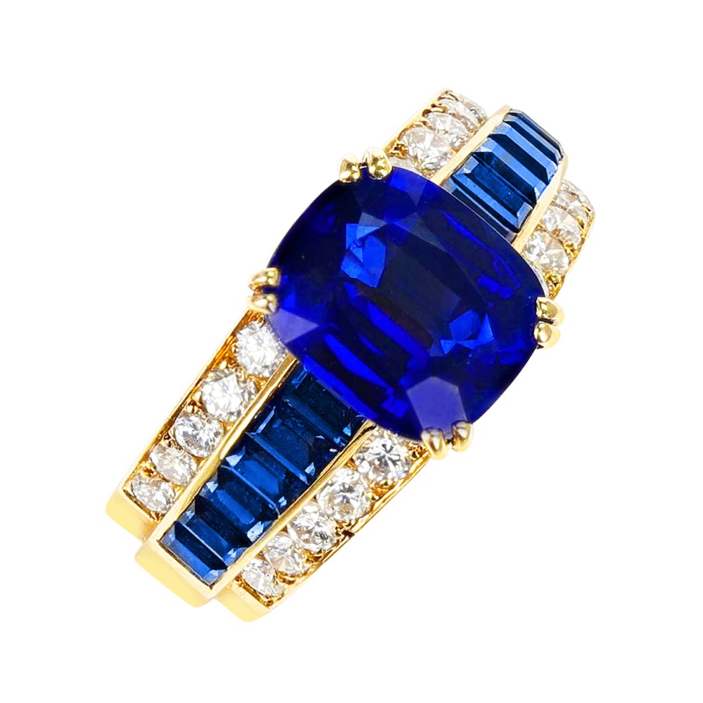 Centering a cushion-shaped sapphire, set with channel set rectangular sapphires on the shank, accented by round diamonds.