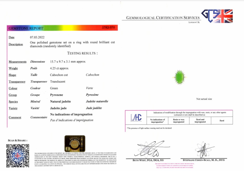 - Accompanied by GCS report number 5782-970, dated 7 March 2022, stating that the cabochon-cut jadeite weighs approximately 4.25 carats, is of natural origin and has no indications of treatment