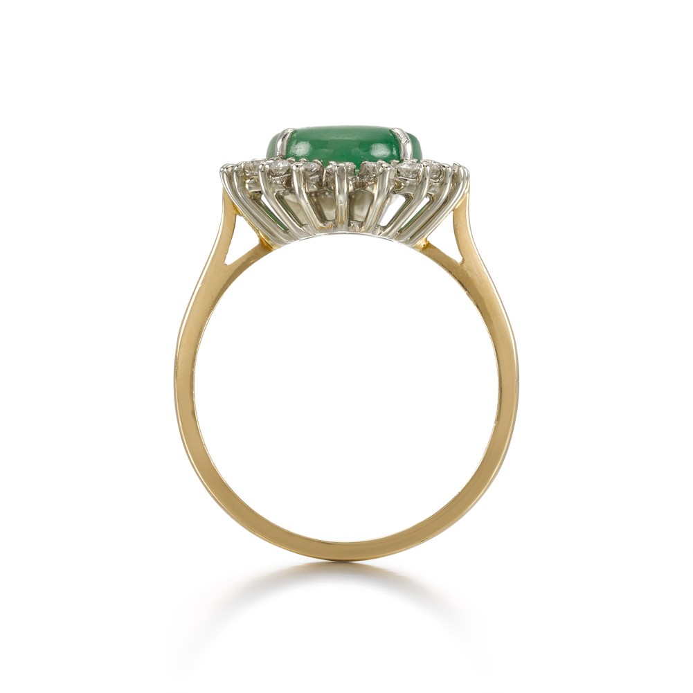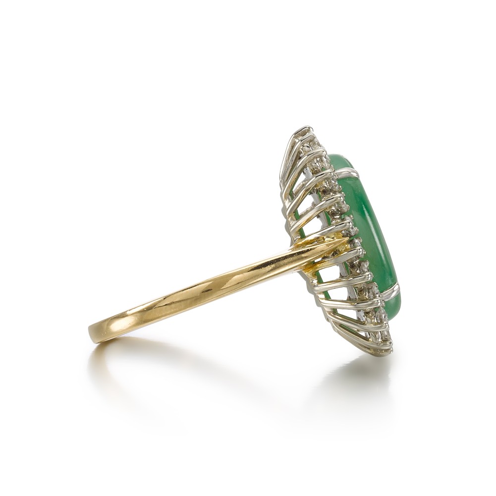 Featuring a claw-set oval cabochon jade surrounded by a halo of 22 round brilliant-cut diamonds.