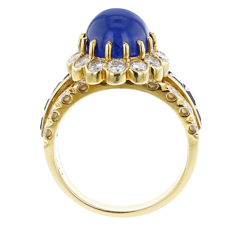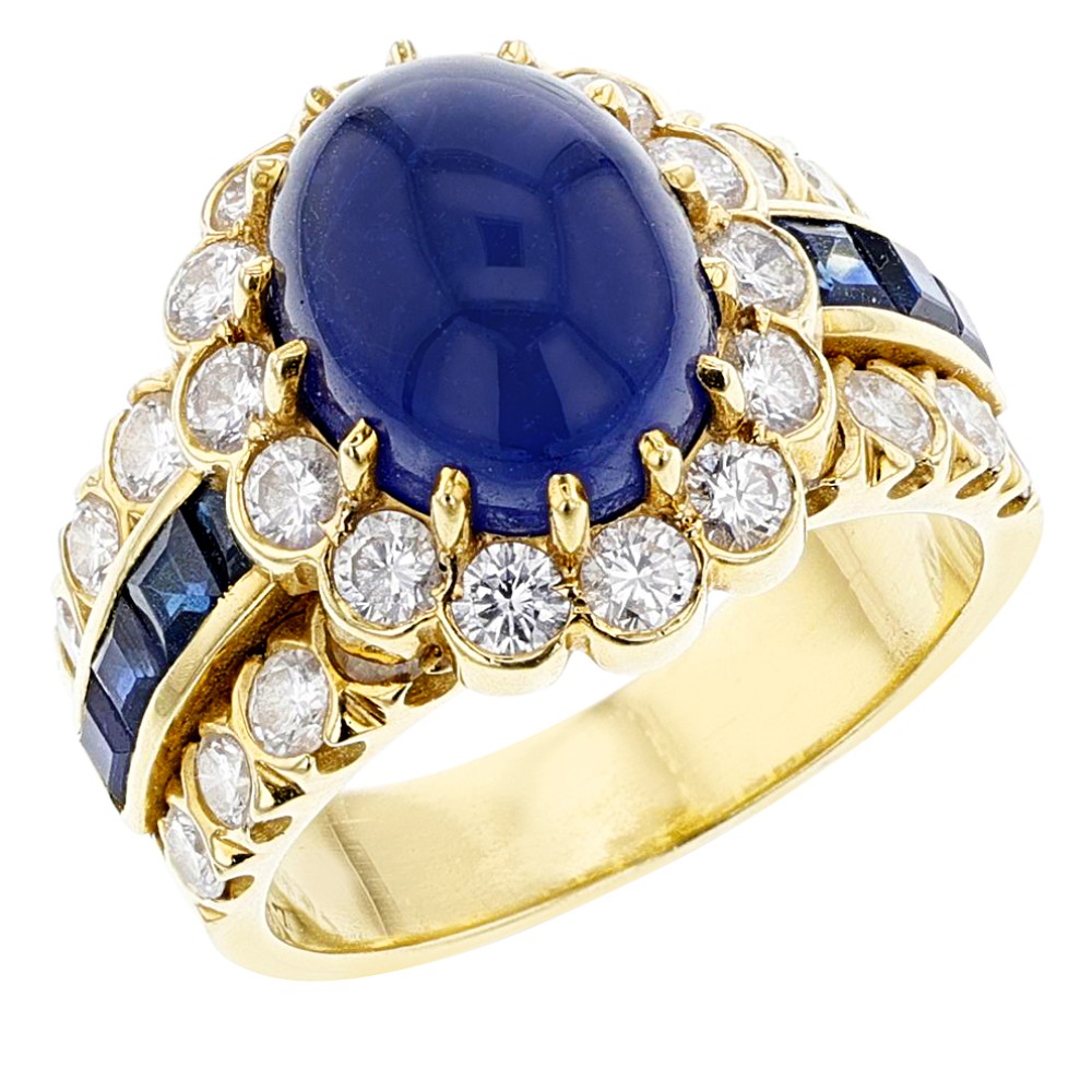 Centering an oval-shaped sapphire cabochon with diamond halo, flanked by 6 calibr?-cut sapphires and 12 round diamonds.