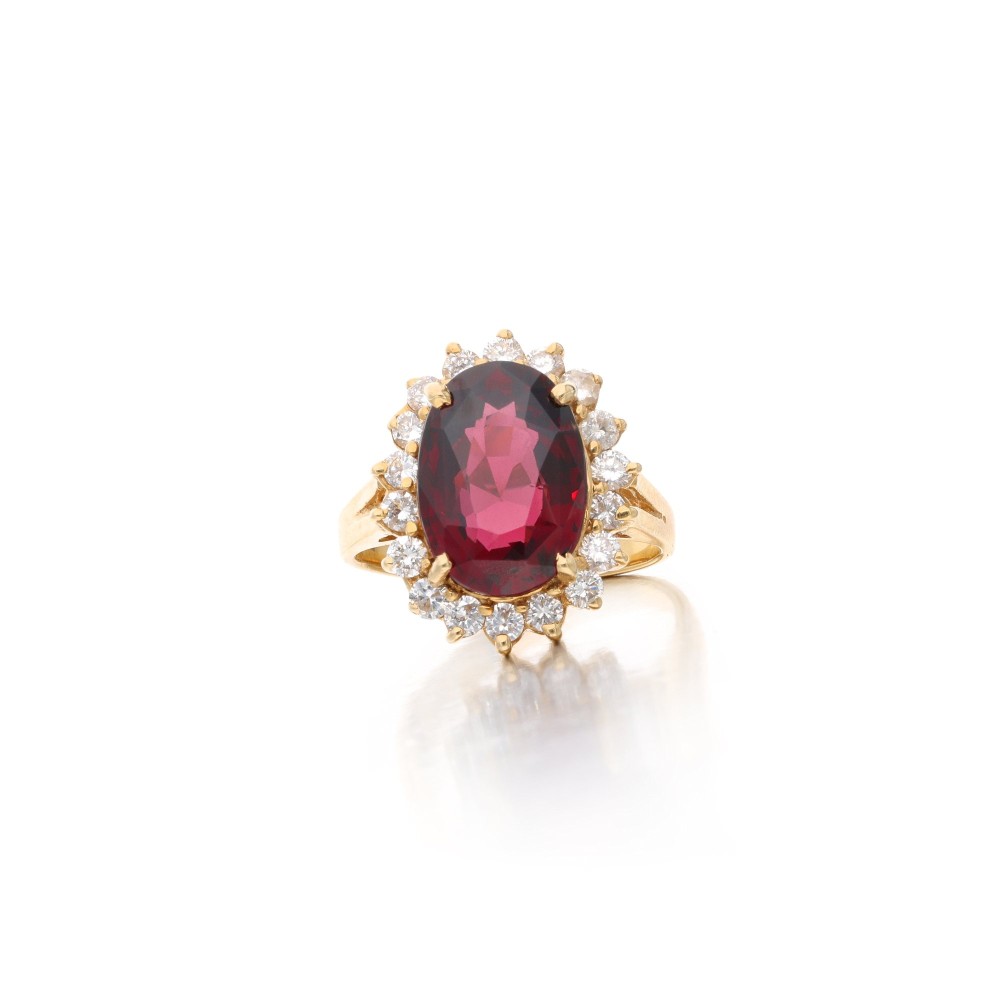 Featuring an oval-shaped garnet and round brilliant-cut diamonds.