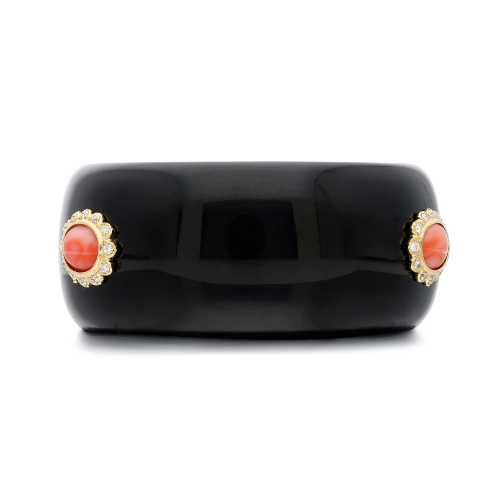 Designed with black agate, accented by 3 pink corals and 36 round diamonds.
