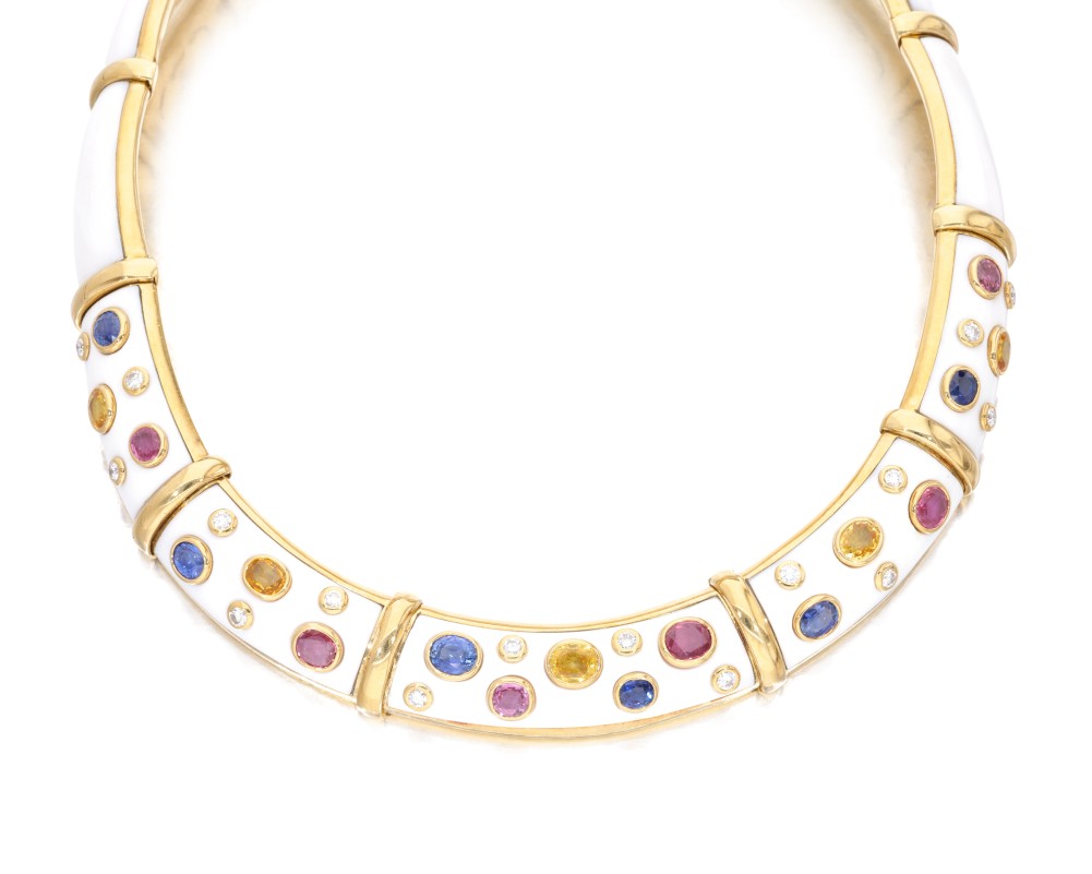 Composed of a white agate collar, accented by oval-shaped blue, yellow and pink sapphires, enhanced by round brilliant-cut diamonds.