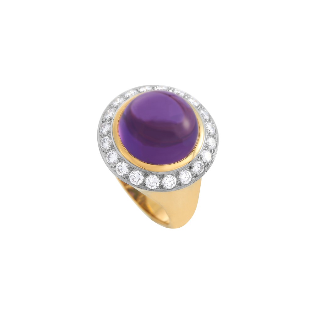 Centering a cabochon-cut amethyst, surrounded by round brilliant-cut diamonds.