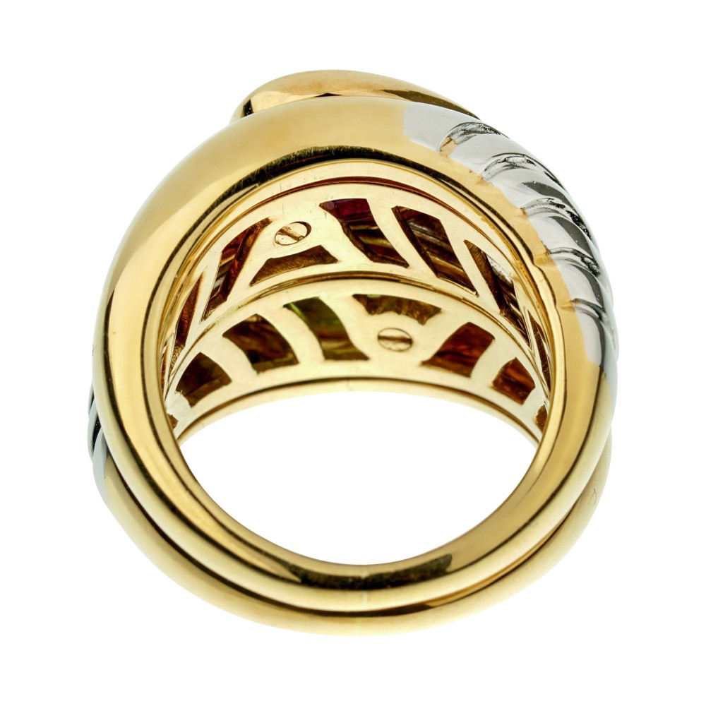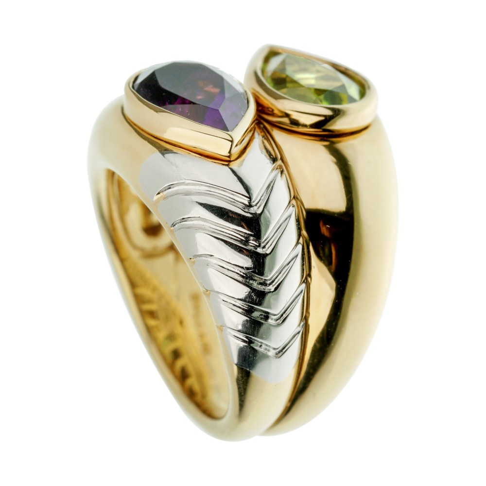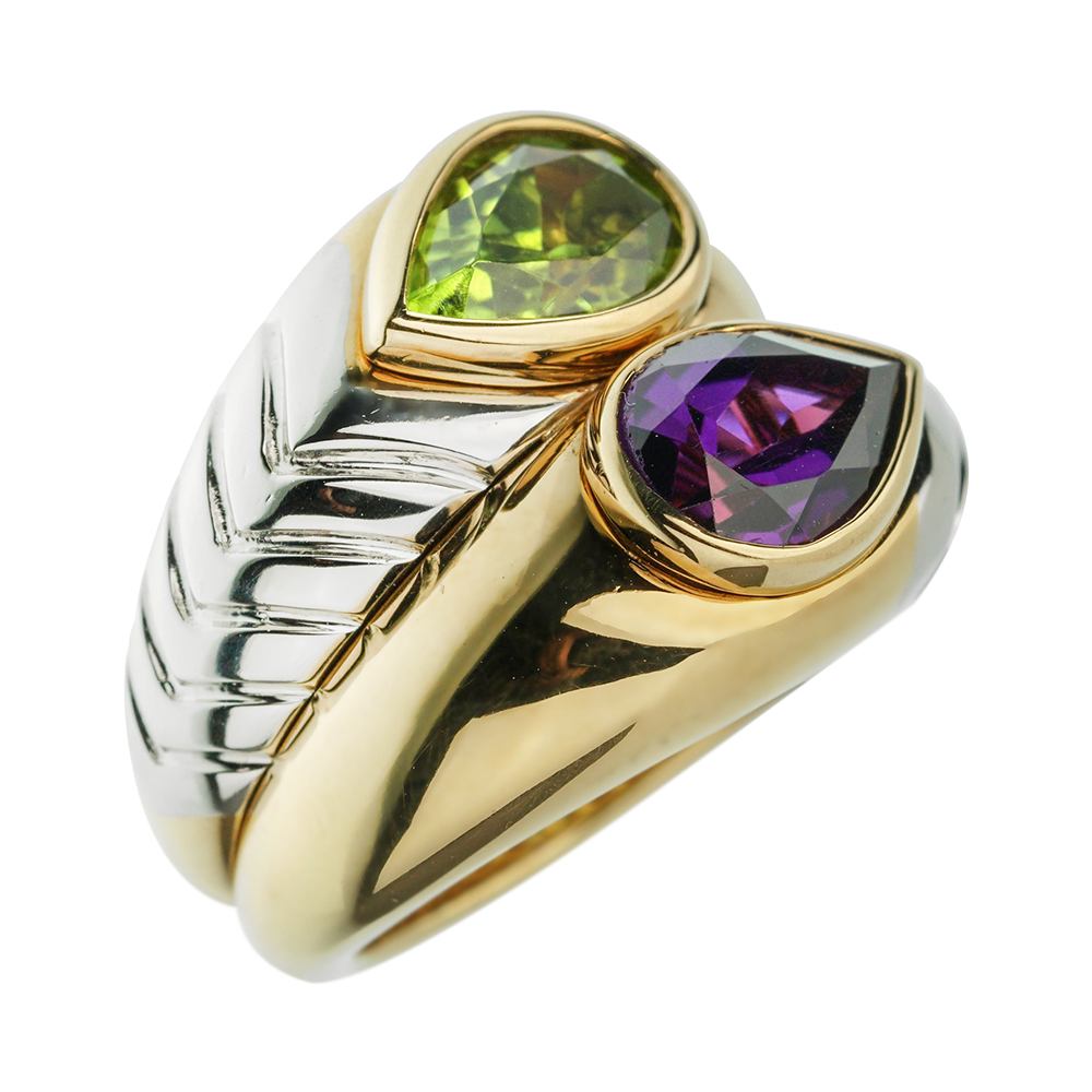 Featuring an amethyst and a peridot, of bypass design.