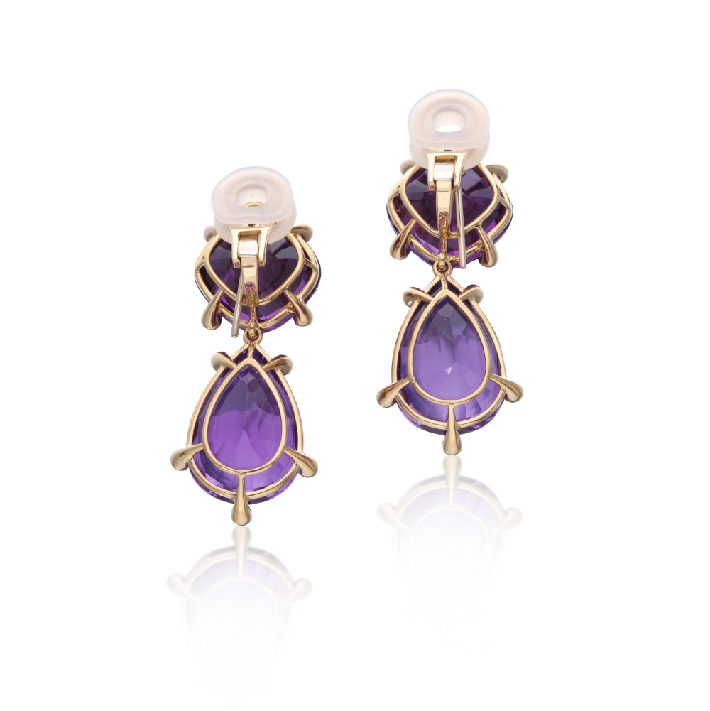 Composed of pear- and cushion-shaped amethysts, accented by round-cut pink tourmaline.