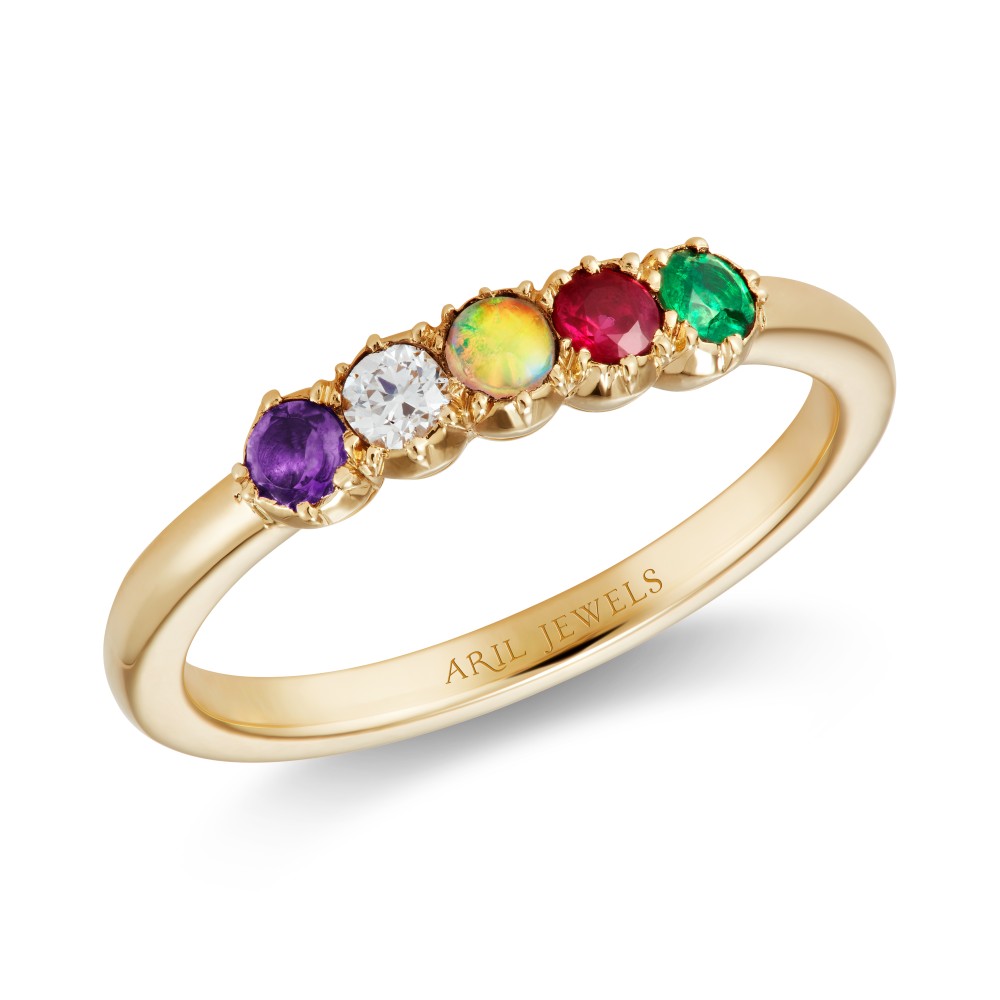 The “Adore” ring inspired by the Georgian acrostic design, meaning the first letter of each gemstone spells out a word, spelling out the word ADORE with an Amethyst, Diamond, Opal, Ruby and Emerald.