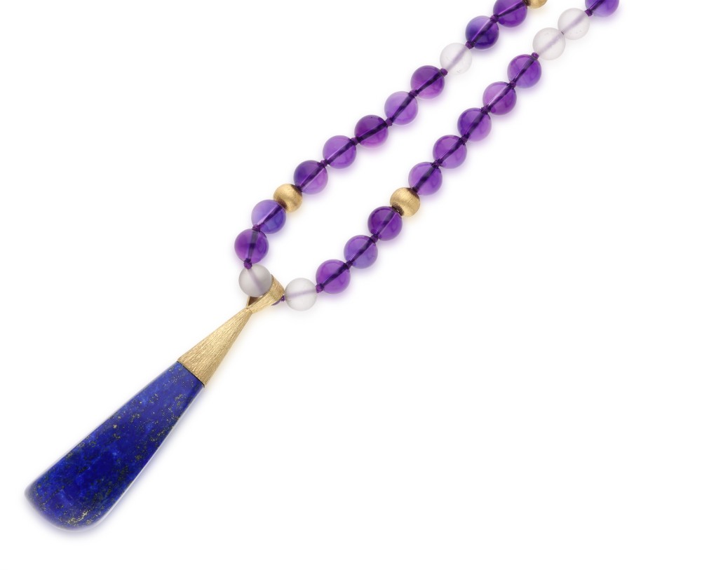 Composed of a lapis lazuli pendant, suspended from a necklace of amethyst and frosted rock crystal quartz beads interspaced by gold beads.