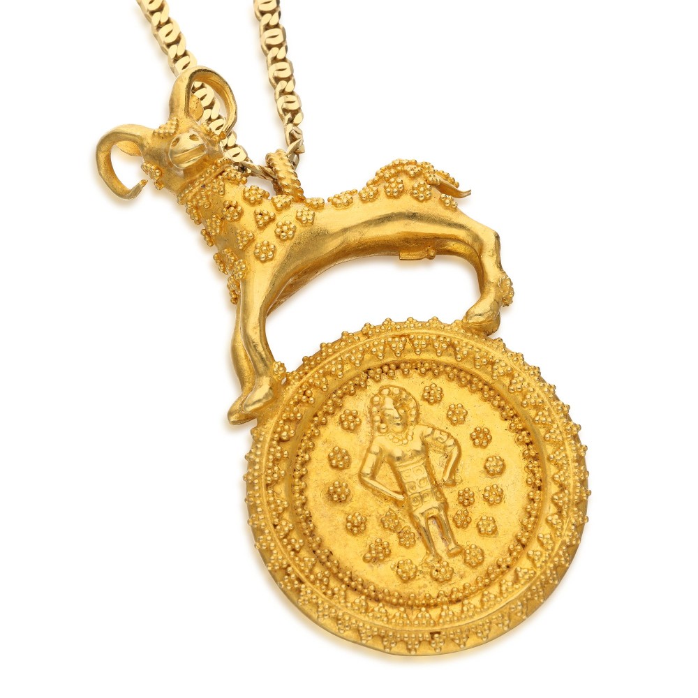 Featuring a coin pendant and ram pendant suspended from a chain.