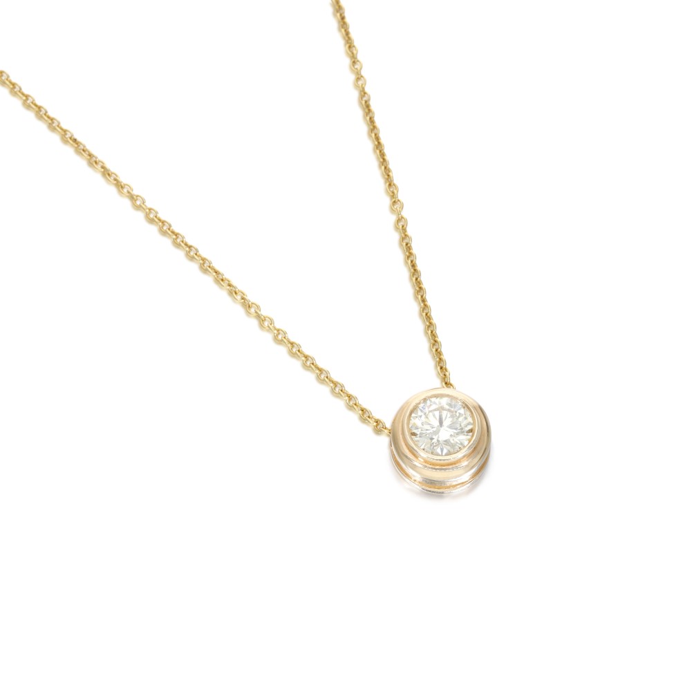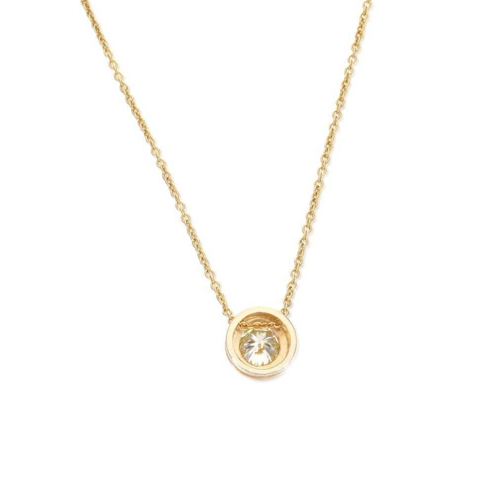 Of a bezel set round brilliant cut yellow diamond.