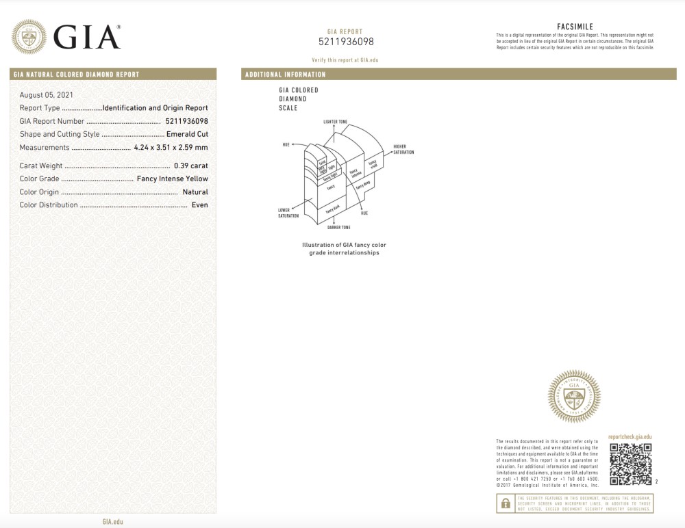 - Accompanied by GIA report no. 5211936098, stating that the 0.39 carat diamond is Fancy Intense Yellow color