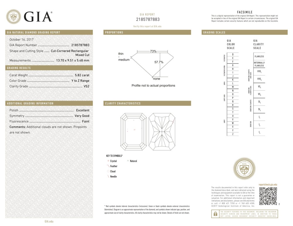 - Accompanied by GIA report no. 2185787883, dated 16 October 2017, stating that the 5.82 carat diamond is Y-Z color and VS2 clarity