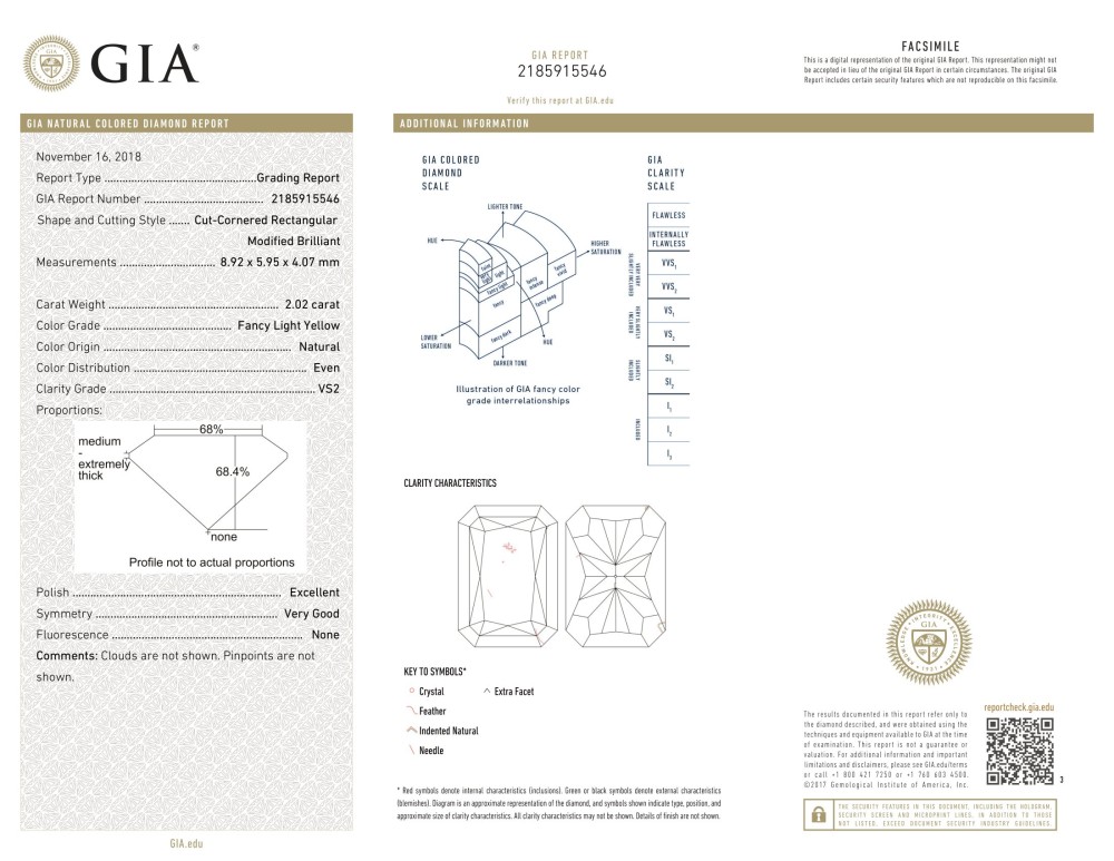 - Accompanied by GIA report no. 2185915546, dated 16 November 2018, stating that the 2.02 carat diamond is Fancy Light Yellow color and VS2 clarity