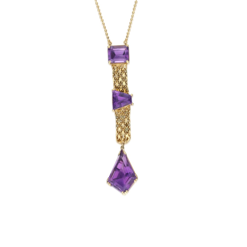 Composed of emerald, kite and trapezoid-shaped amethysts.