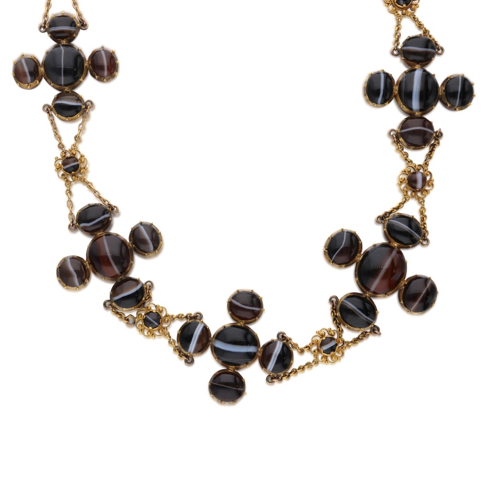 Composed of banded agate cabochons arranged as crosses and interspaced by filigree links.