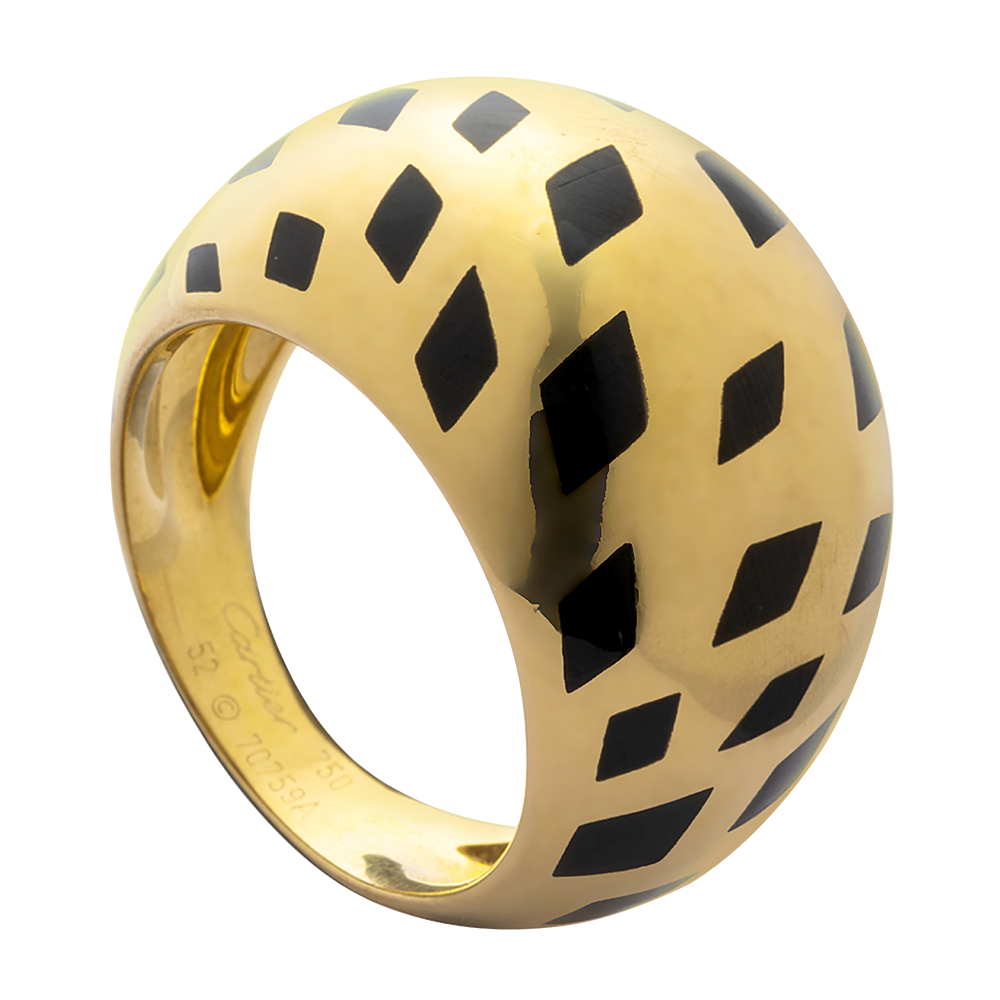 The dome ring features a bombe design of diamond-shaped black enamel spots.