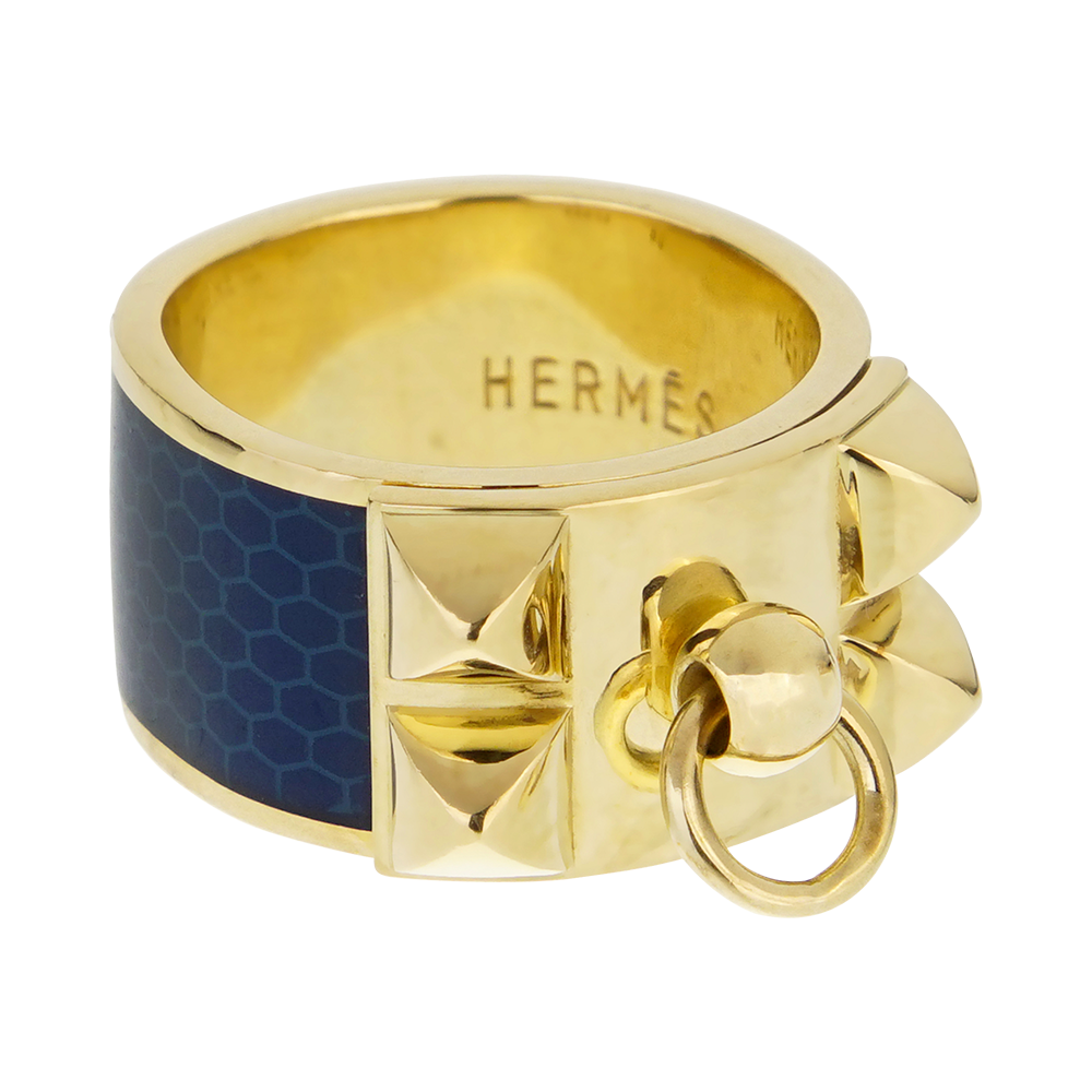 The ring is designed as a blue enamel and gold band, featuring a three-dimensional gold dog collar motif; the enamel features a honeycomb pattern.