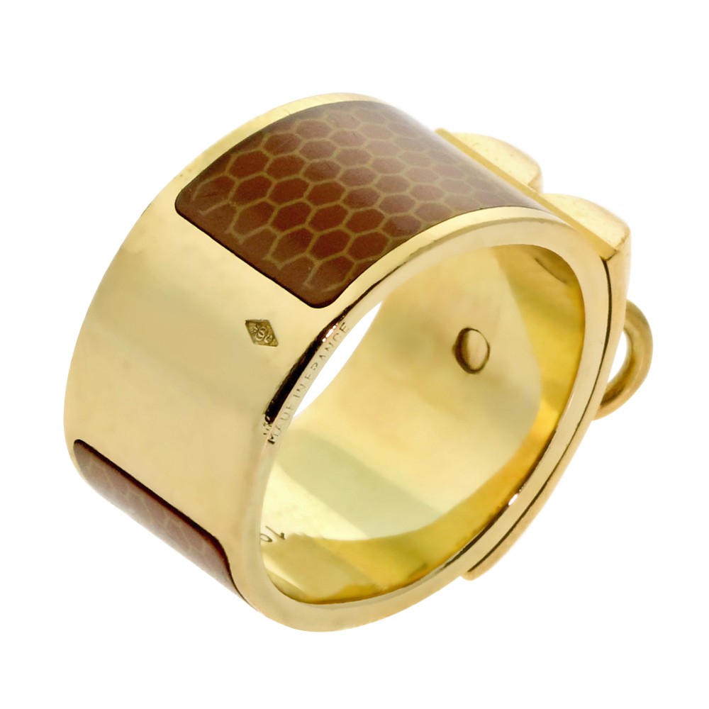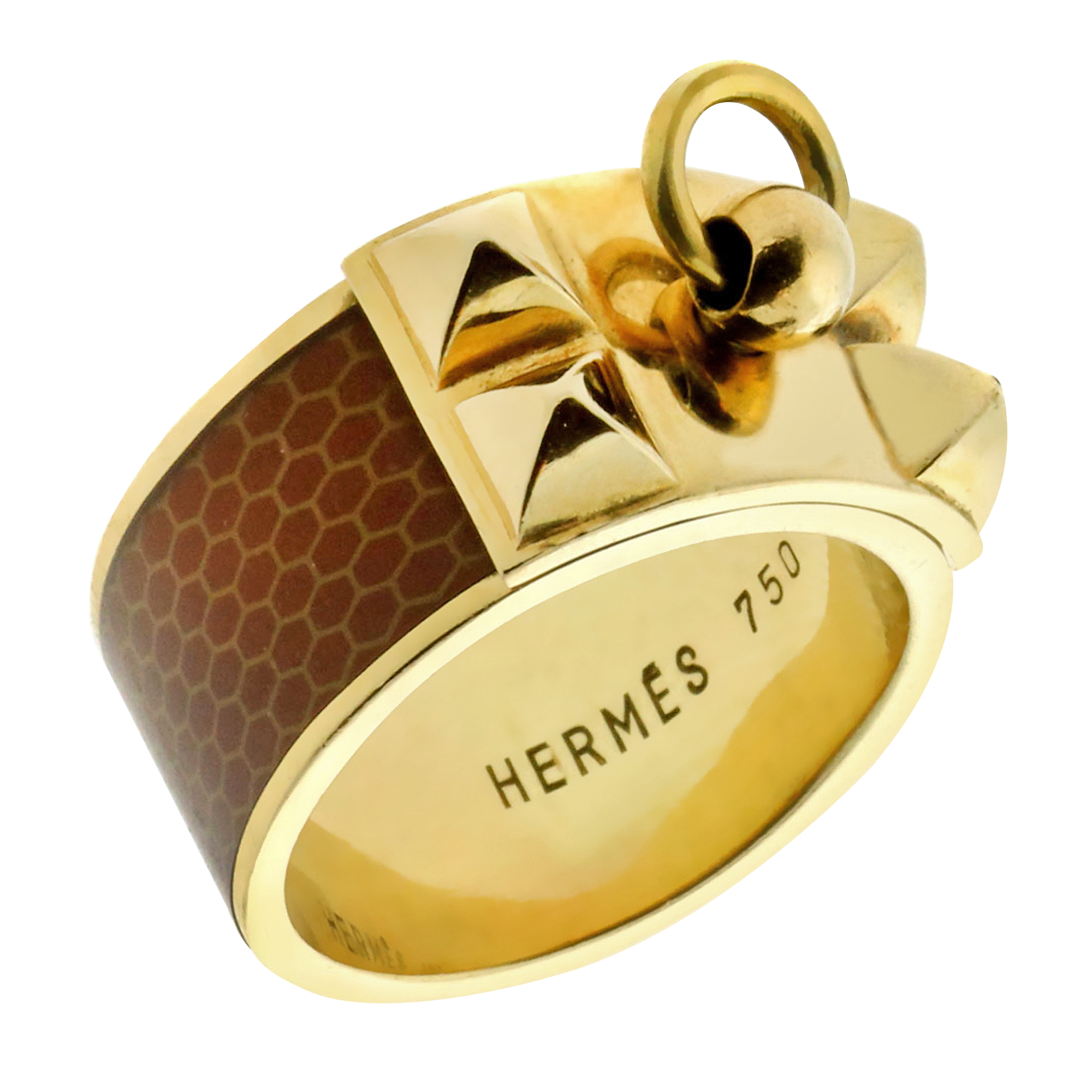 The ring is designed as a brown enamel and gold band, featuring a three-dimensional gold dog collar motif; the enamel features a honeycomb pattern.