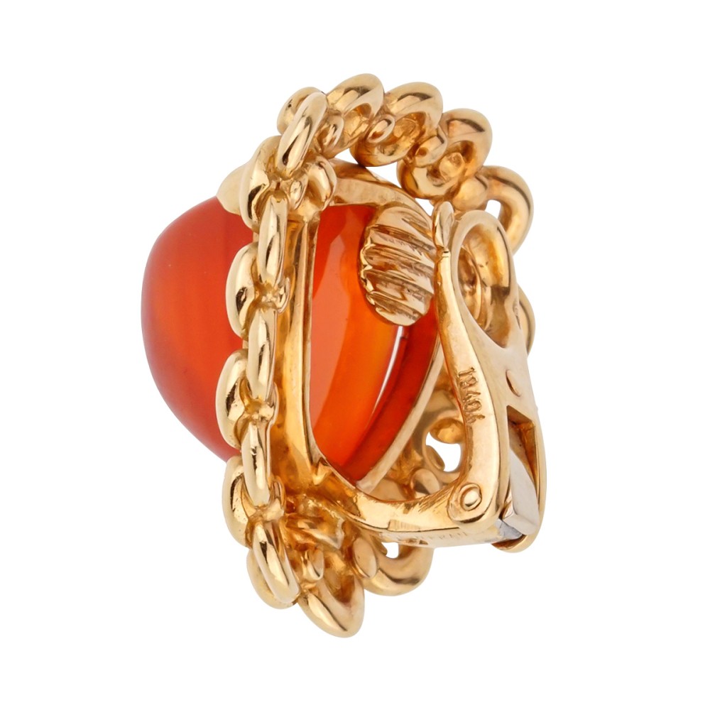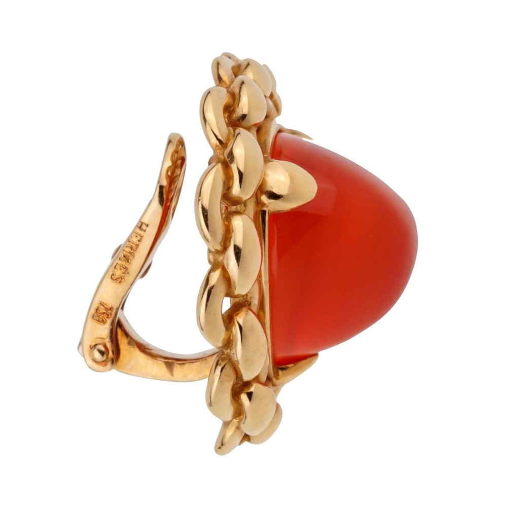 The earclips centering sugarloaf-shaped carnelian stones framed by a gold chain-link motif.