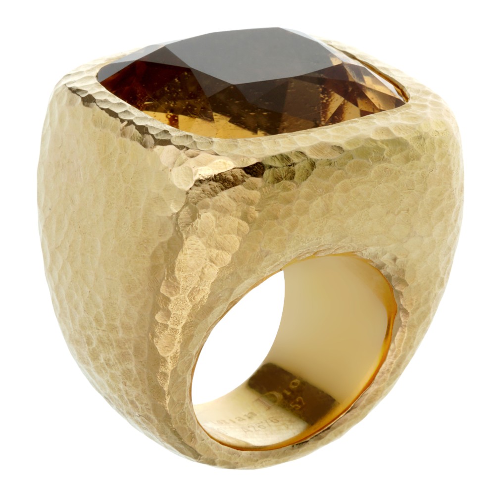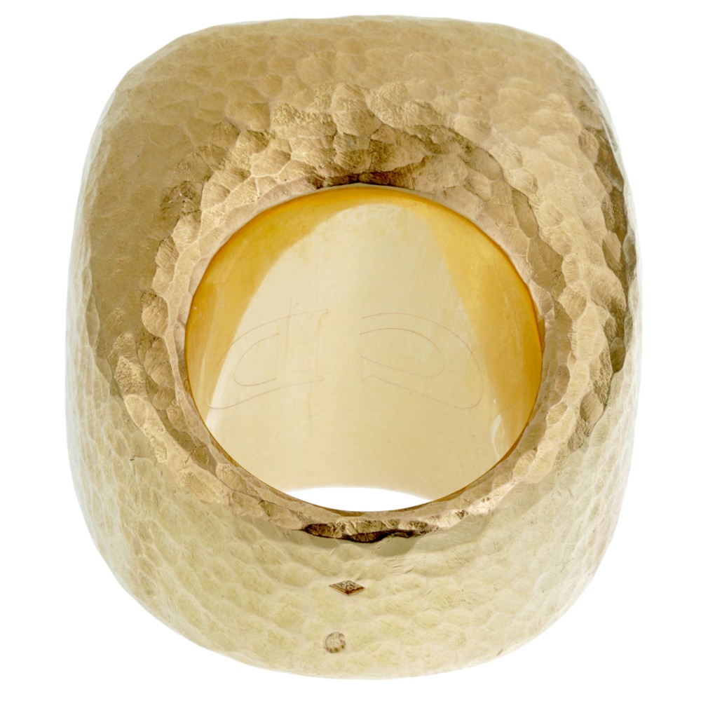 The ring designed as a square-shaped citrine set in a large hammered gold band.
