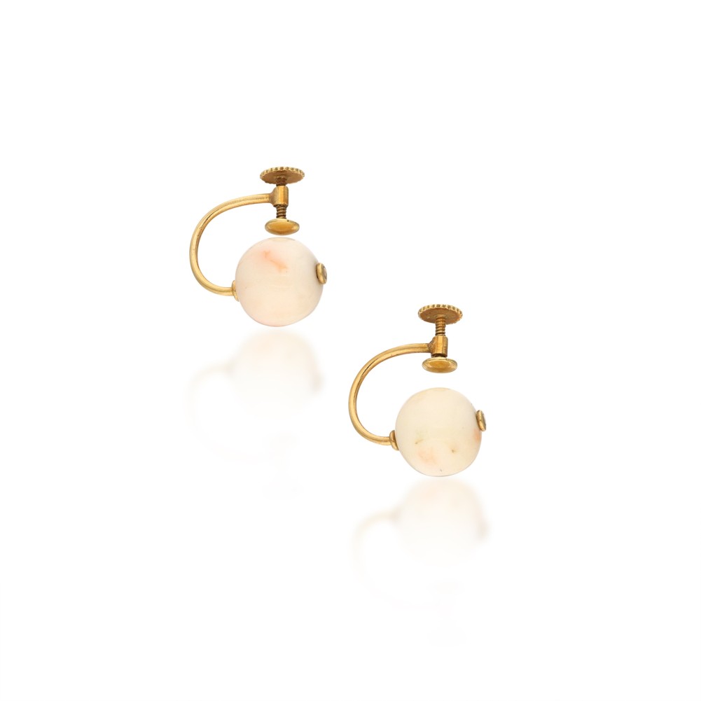 Composed of coral beads on a knotted strand with matching earrings.