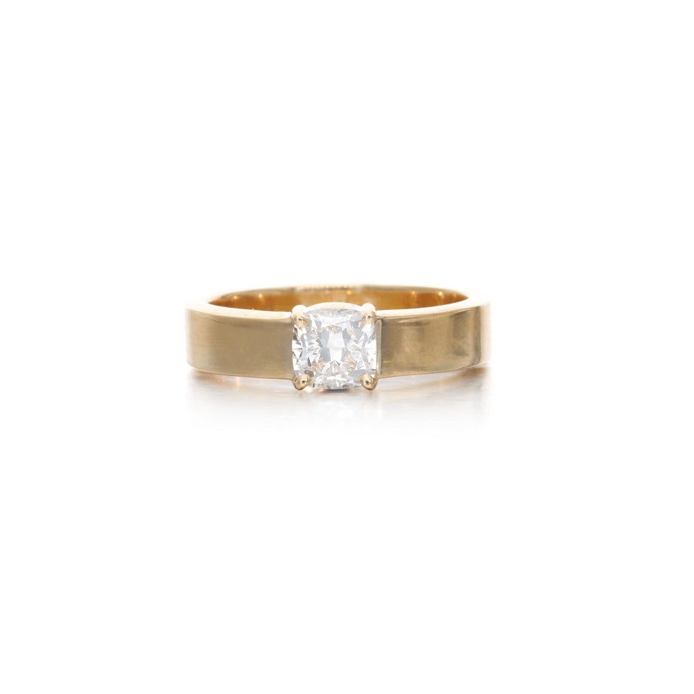 Composed of a cushion-shaped diamond.