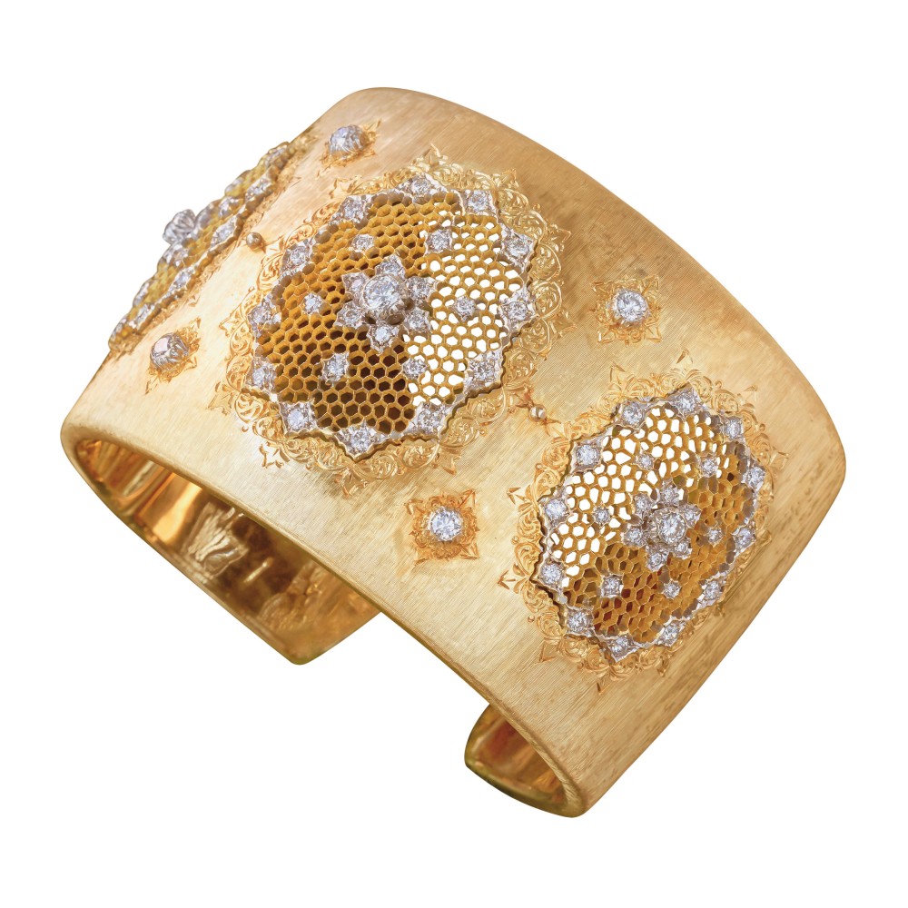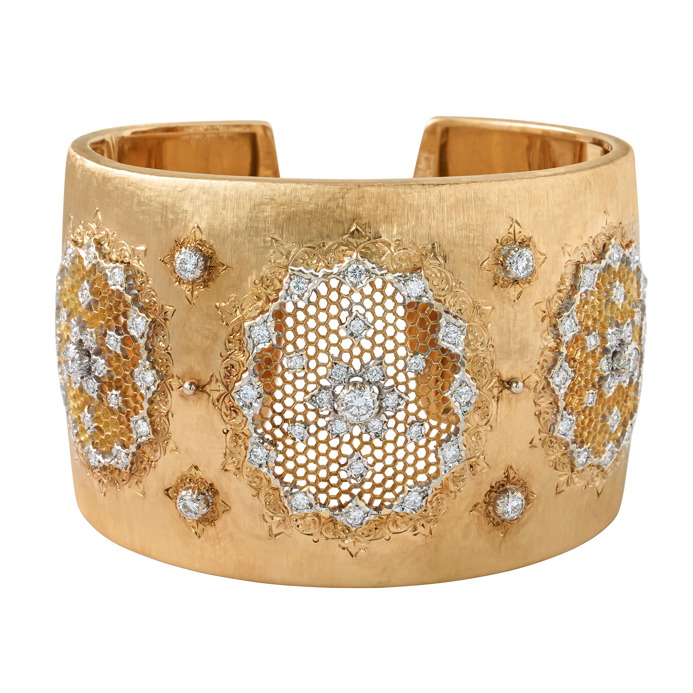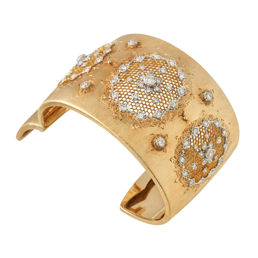 Composed of round brilliant-cut diamonds set in a pierced and engraved cuff bracelet.
