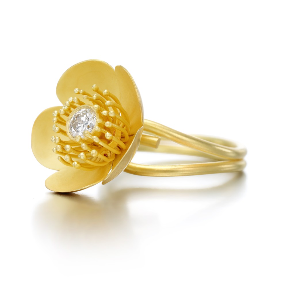 Handcrafted as buttercup, the stamen collet set with a brilliant cut diamond.