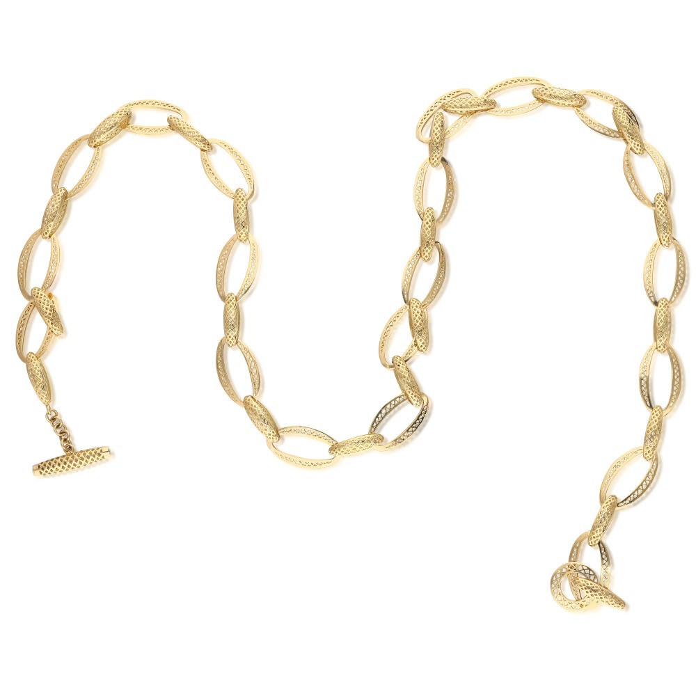 Composed of pierced gold links and round brilliant-cut diamonds set in the toggle.