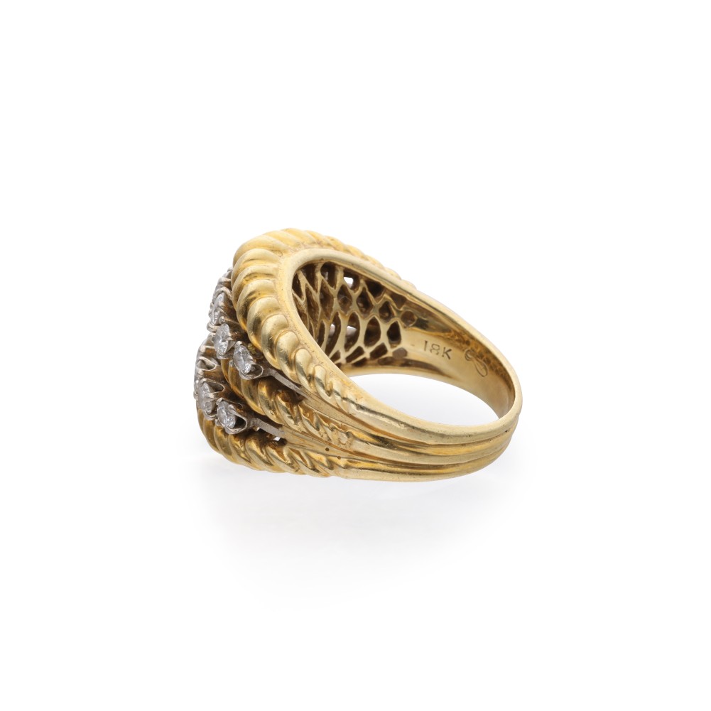Composed of 2 rows of 7 round brilliant-cut diamonds, bordered by twisted gold.