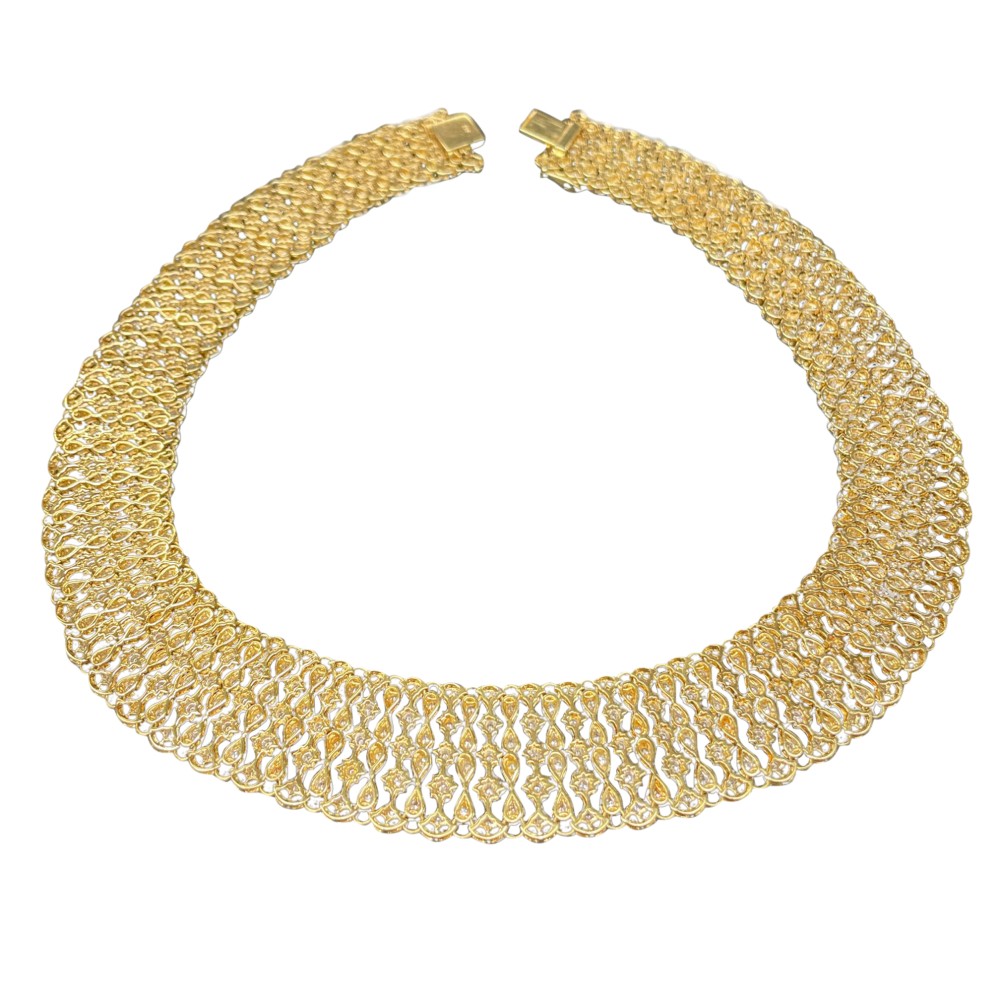 The necklace is designed as a flexible collar, set with variously cut diamonds.