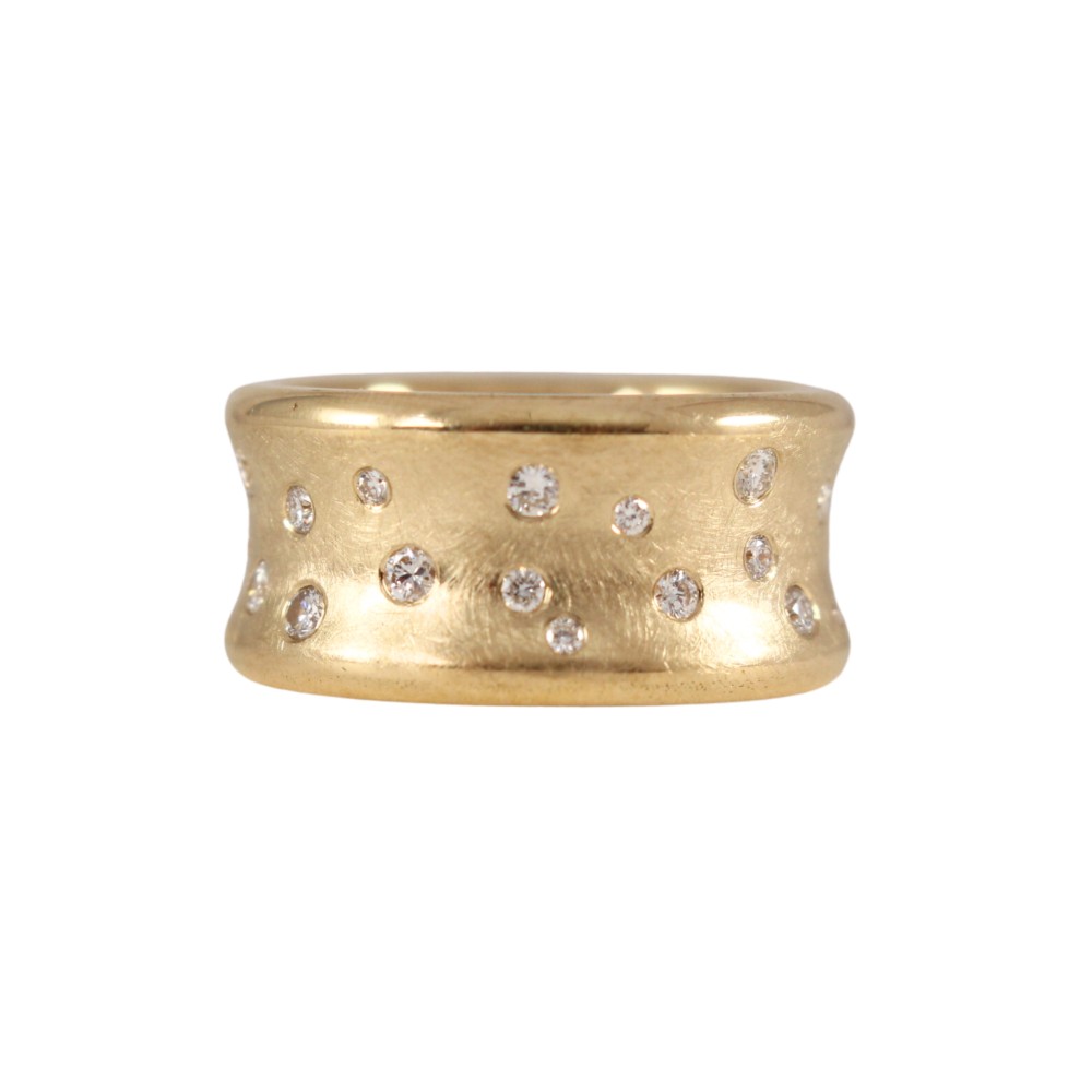 Of a concave band, set with numerous round diamonds.