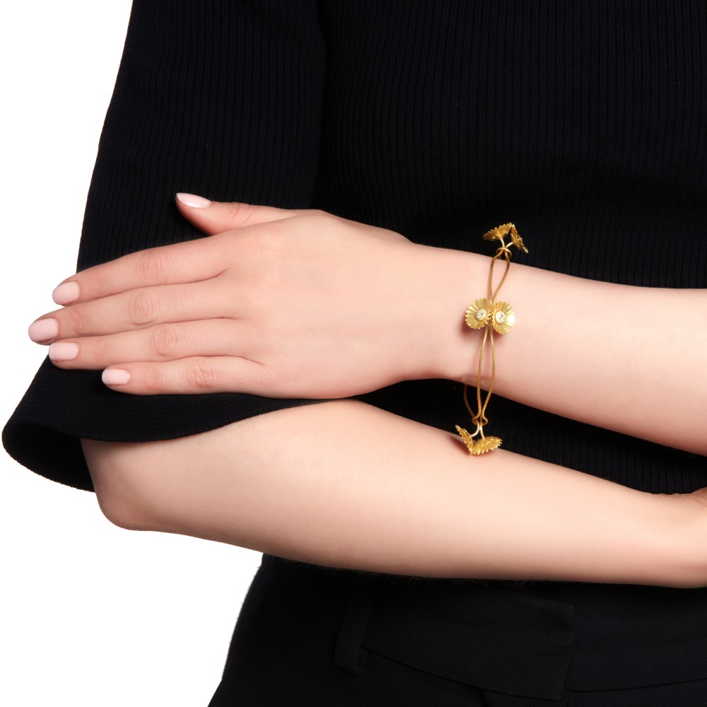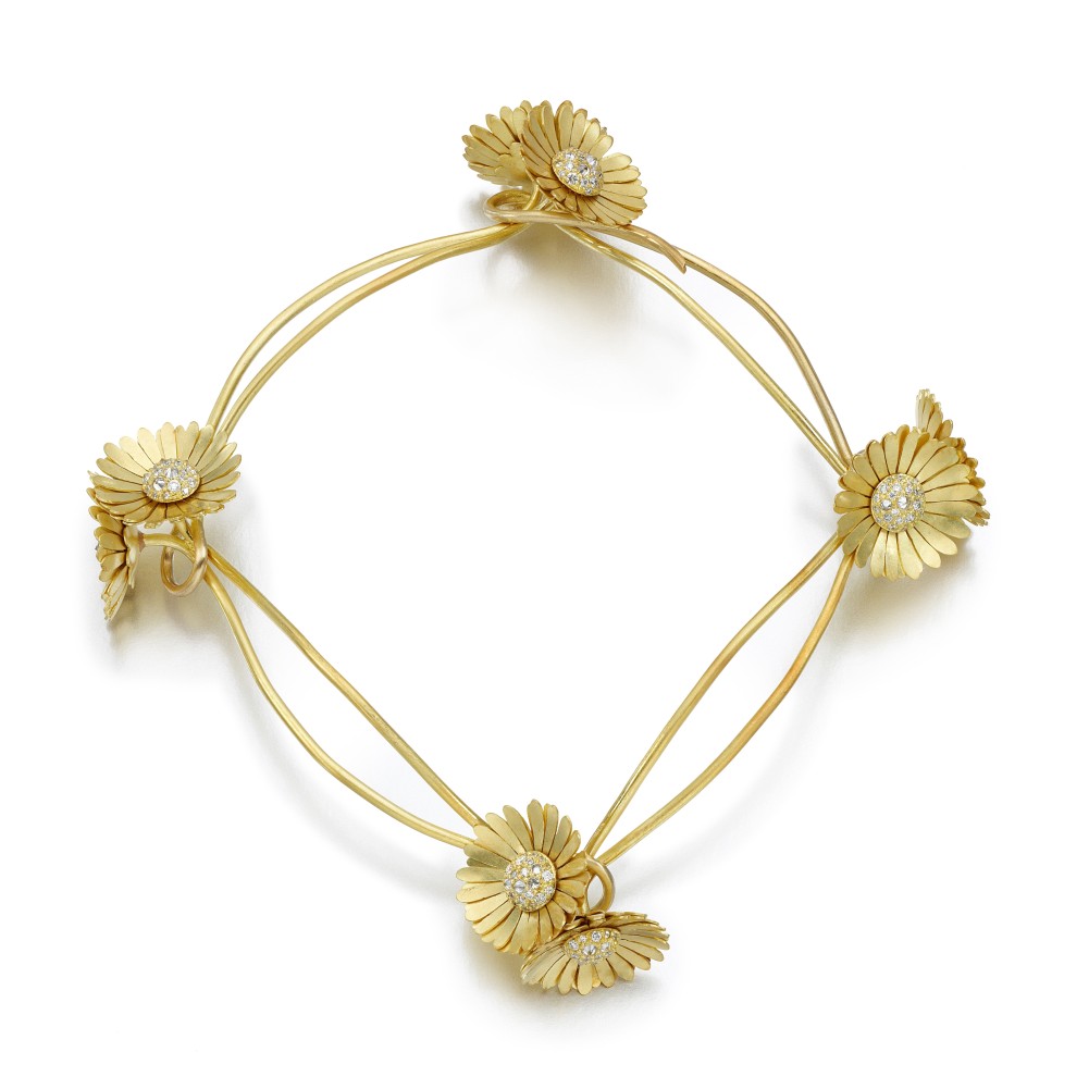Handcrafted as a double bracelet of daisies, each set with brilliant cut diamonds.