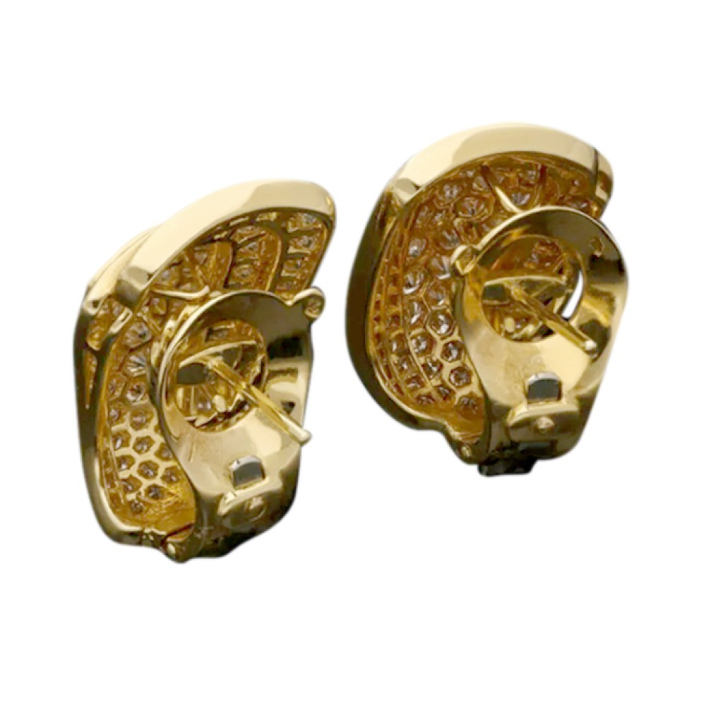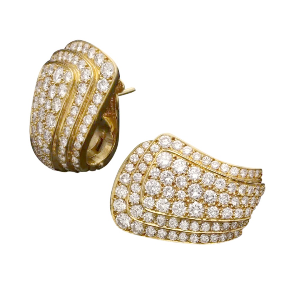 Each set with numerous round brilliant cut diamonds in a fan-like design.