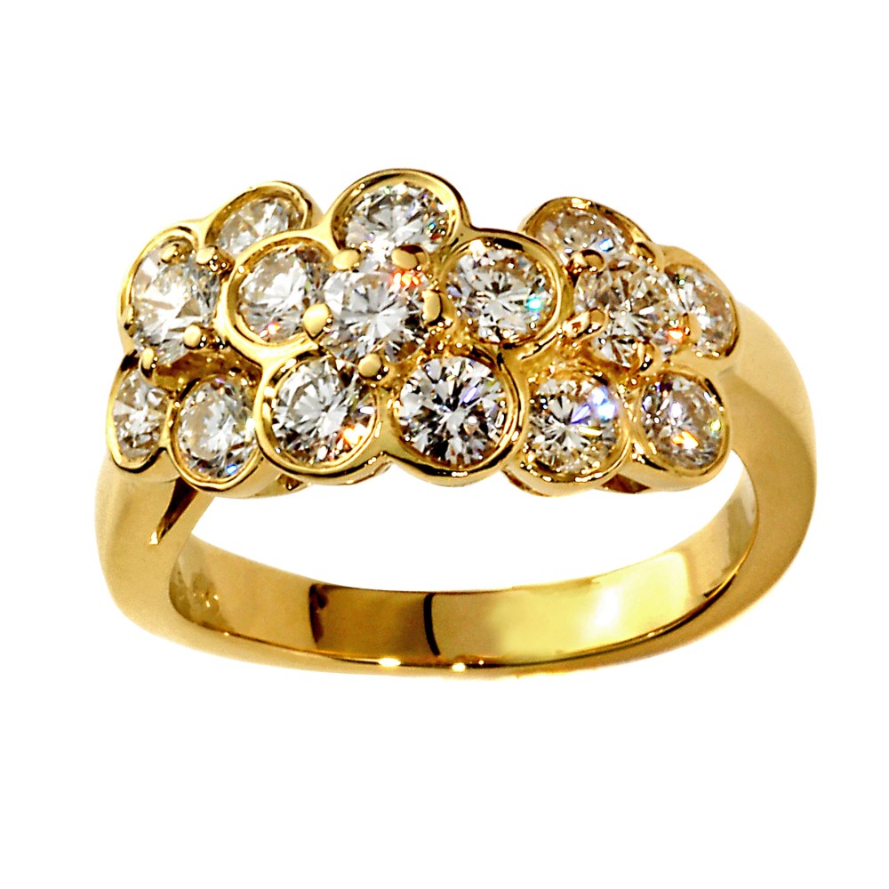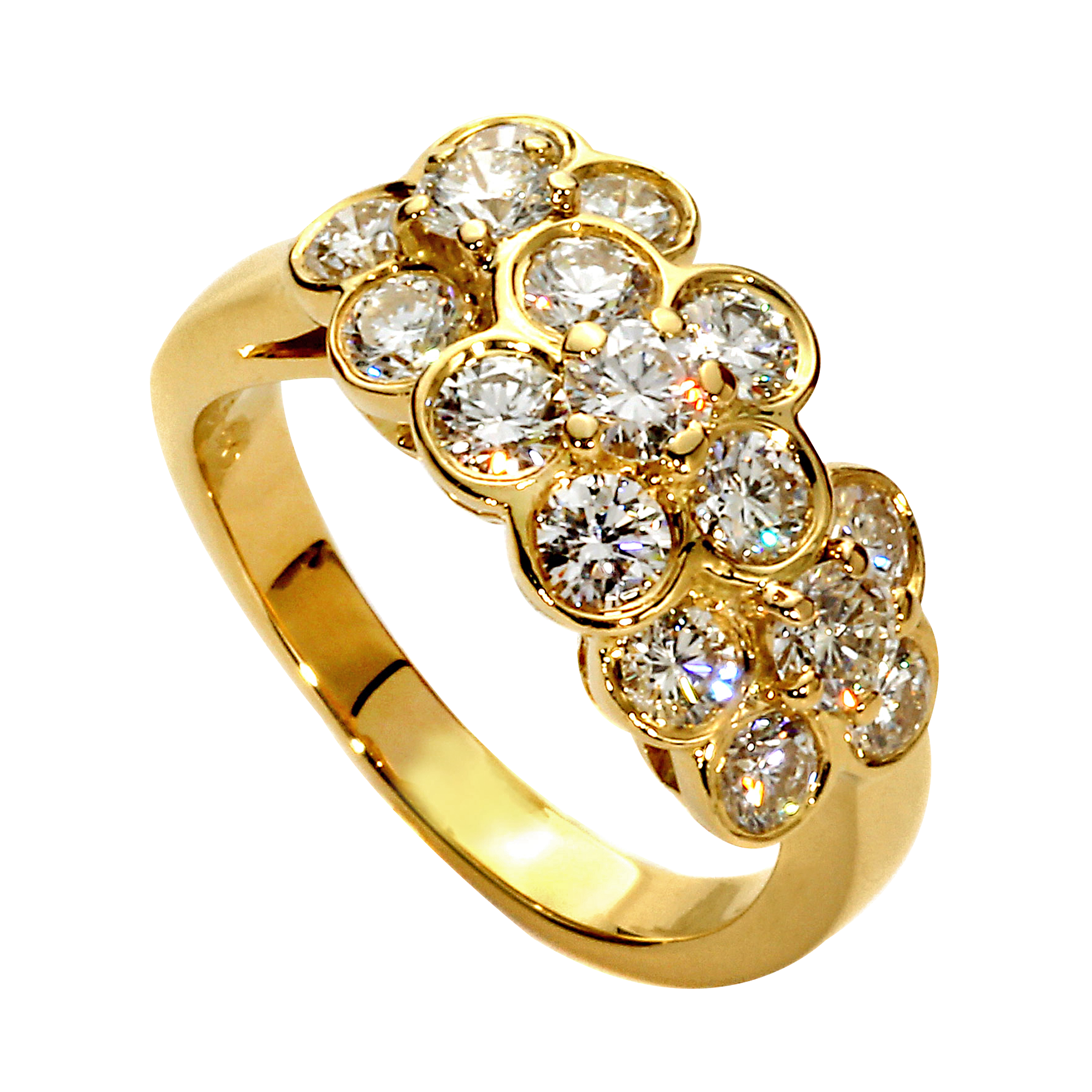 The ring designed as 3 overlapping flowers, each flower set with numerous round diamonds.