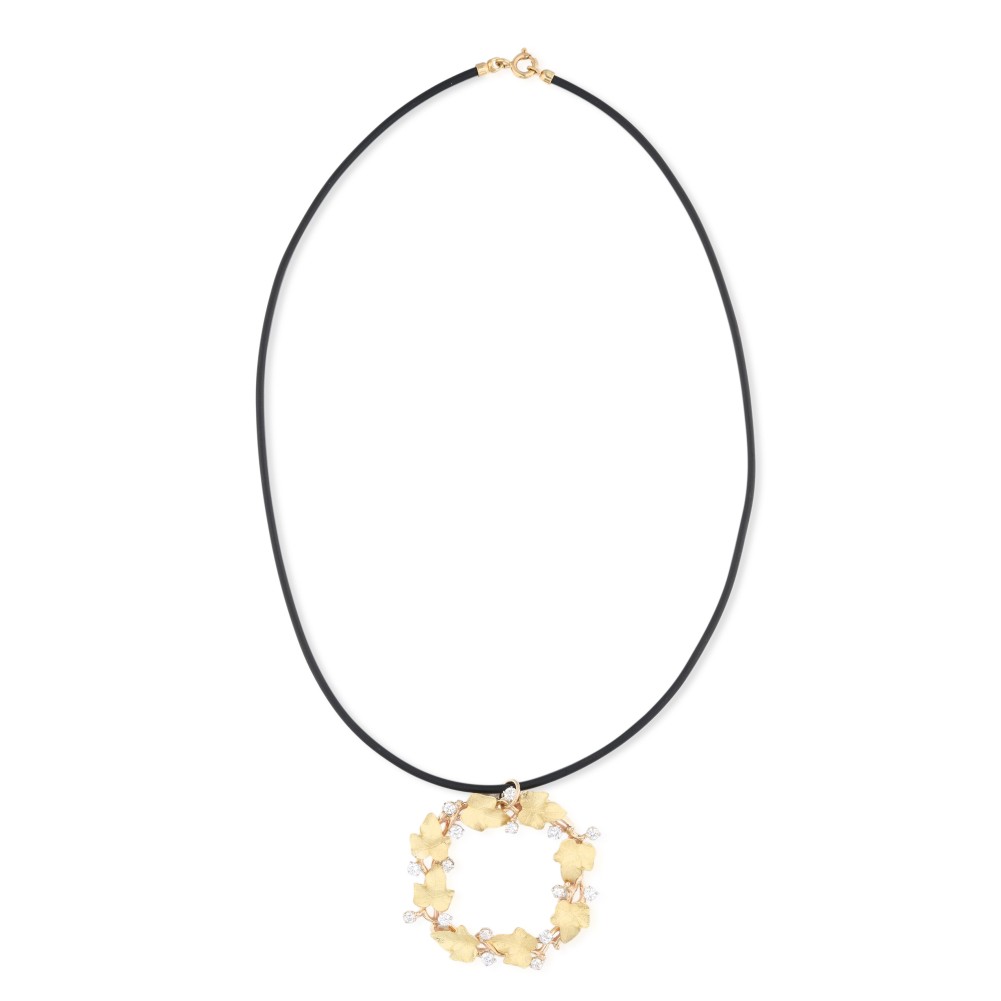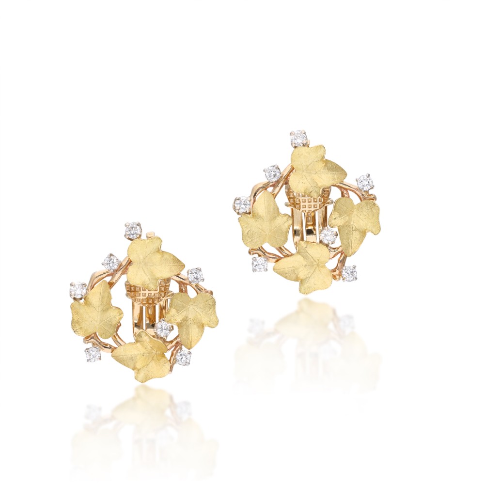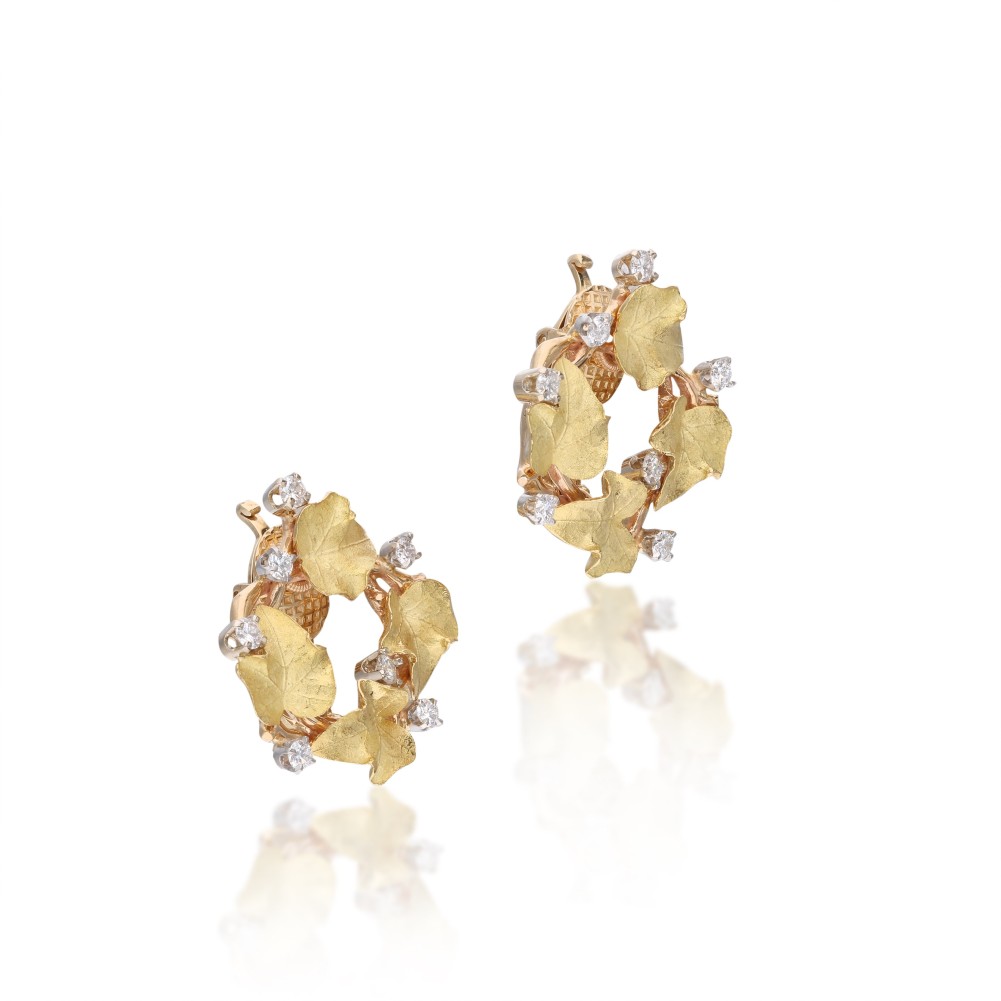 Composed of round brilliant-cut diamonds set in a wreath pattern.