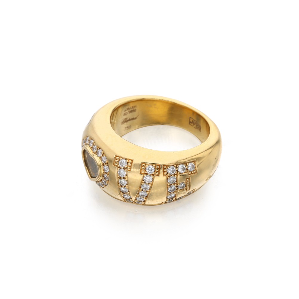 Of the Happy Diamonds collection, the Love band features round brilliant-cut diamonds and a floating diamond under sapphire crystal.