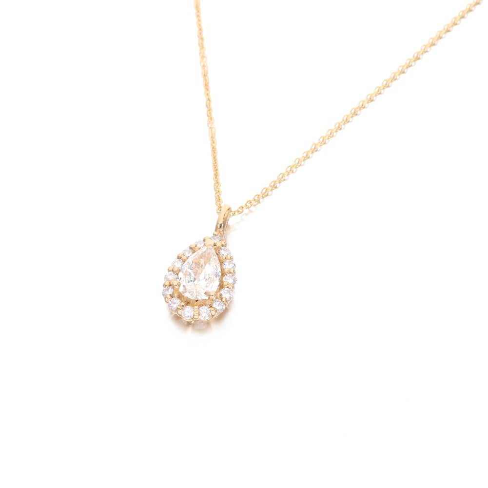 Centering a pear-shaped diamond, surrounded by round brilliant-cut diamonds.